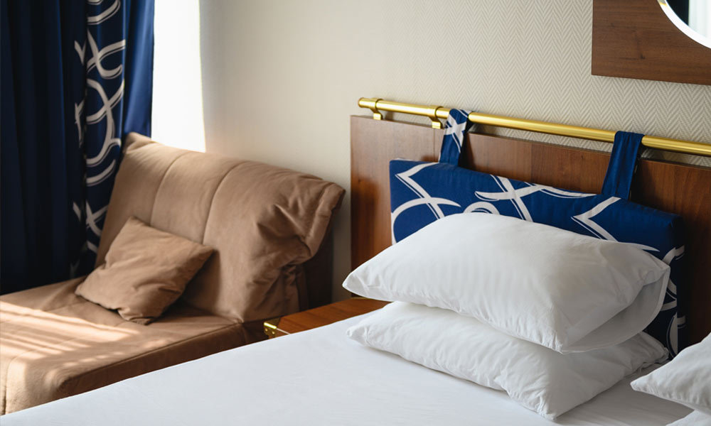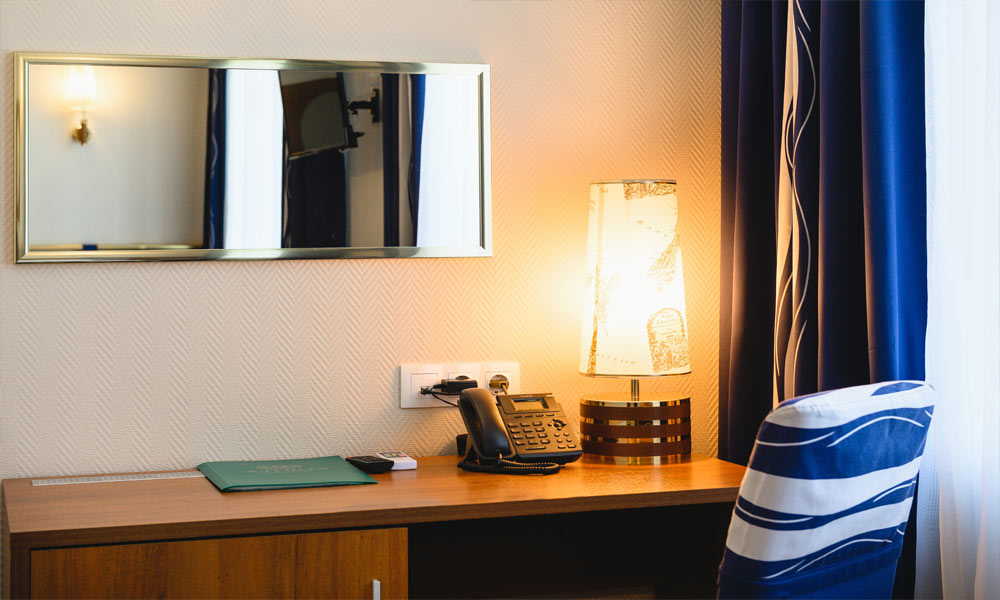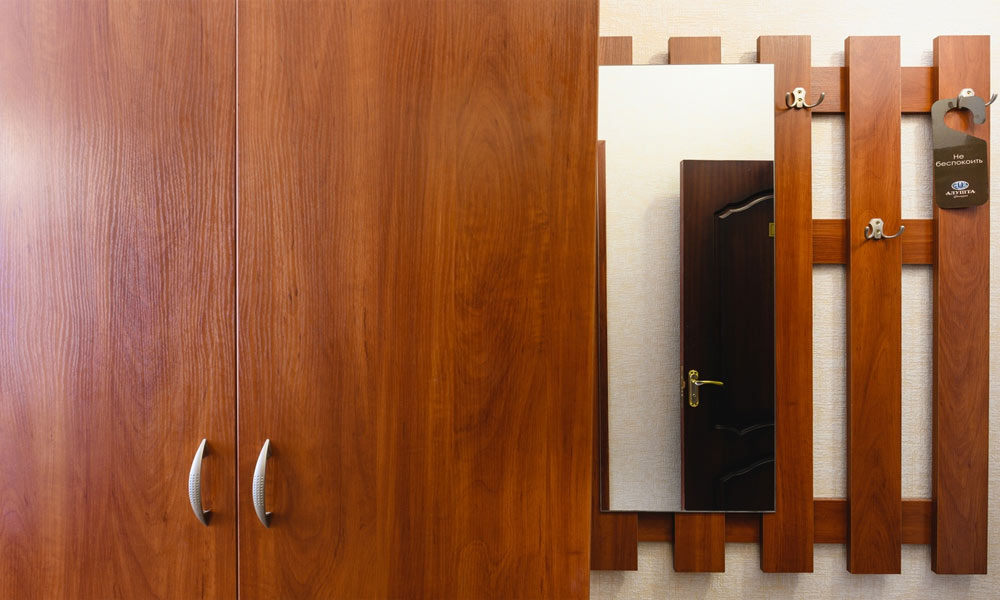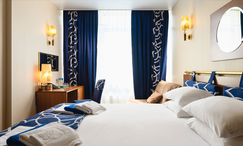 Мебель: Две раздельные односпальные кровати или двуспальная кровать, шкаф, тумбочки, раскладное кресло.