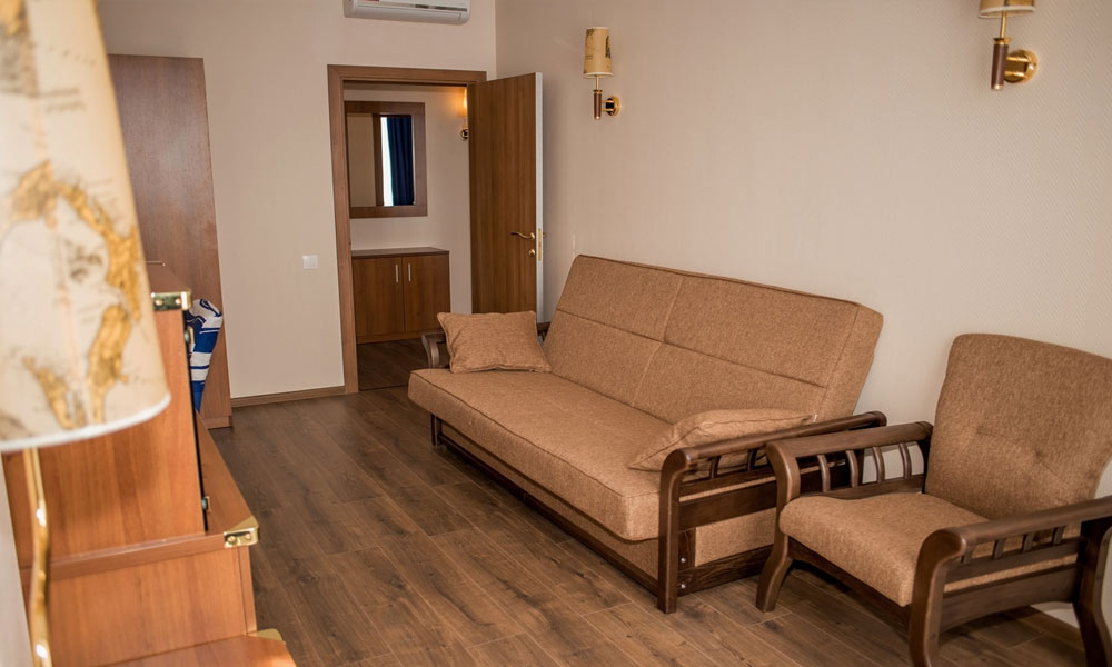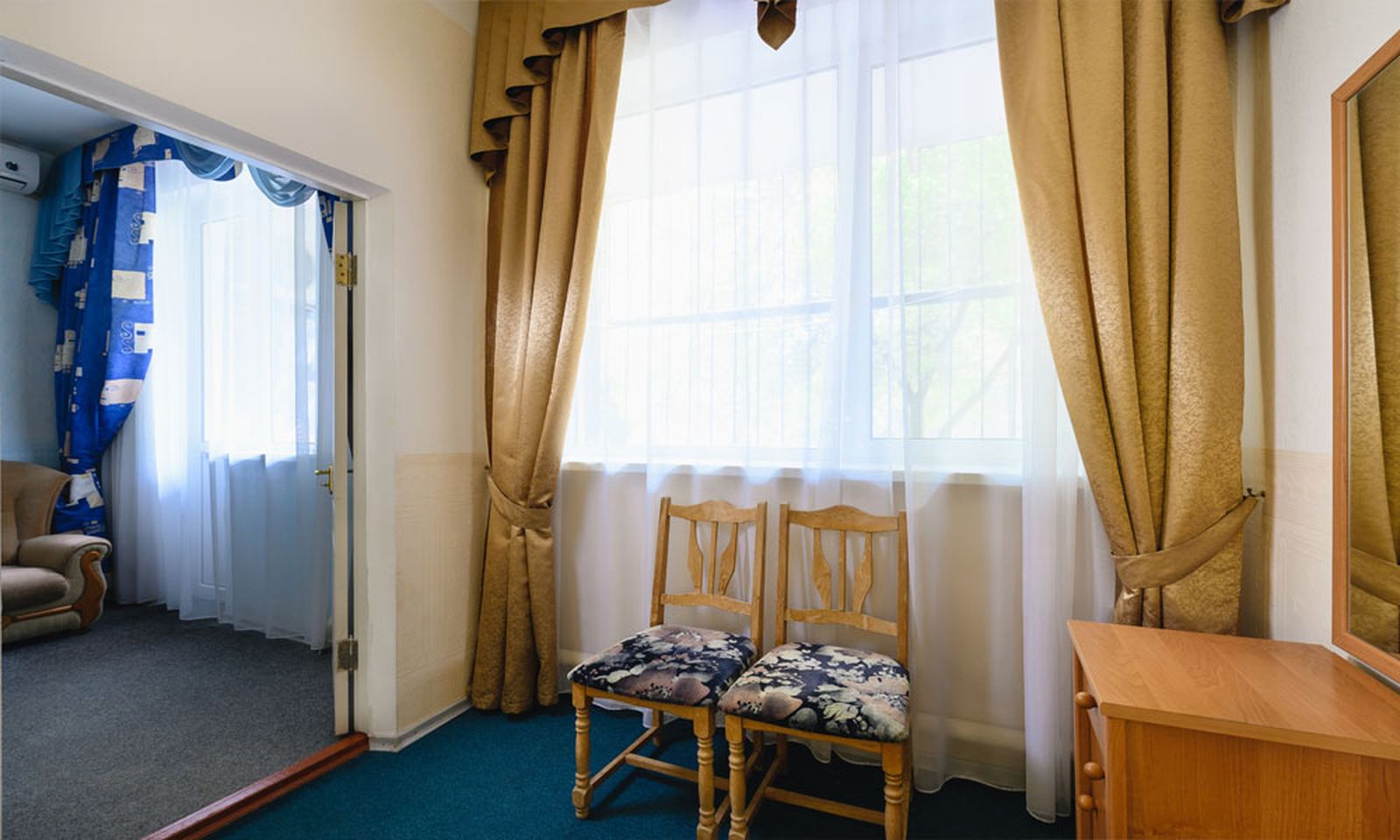 Мебель: Четыре раздельные односпальные кровати или две двуспальные кровати, шкаф, тумбочки, два раскладных кресла.