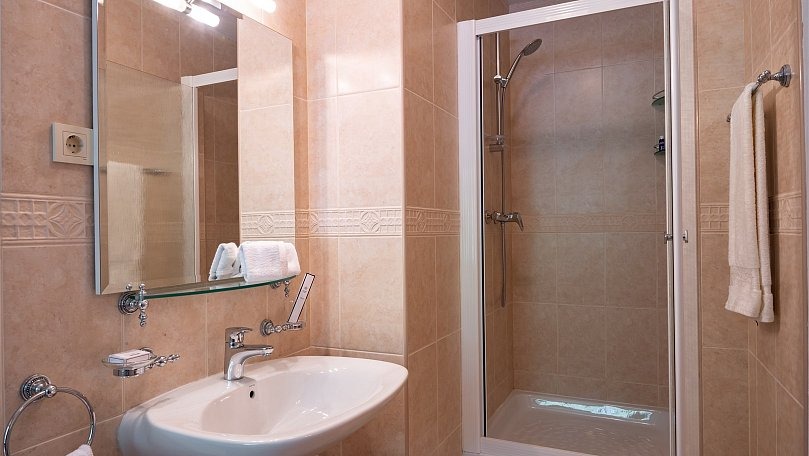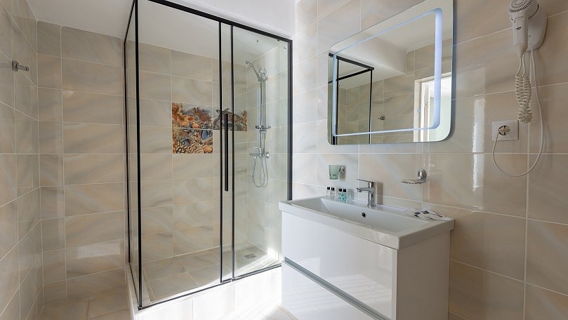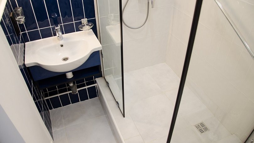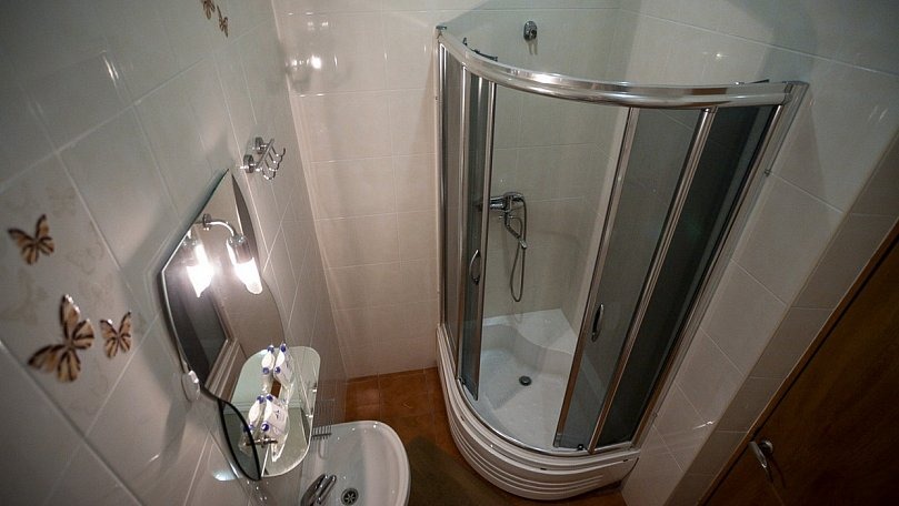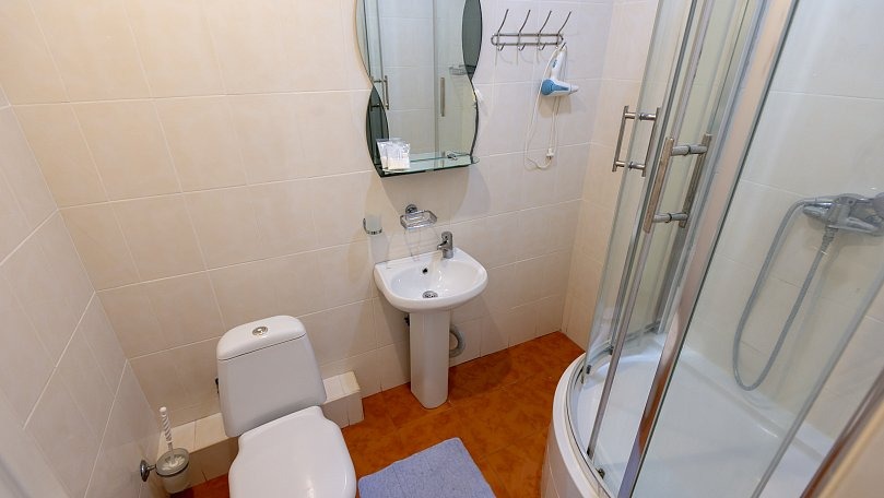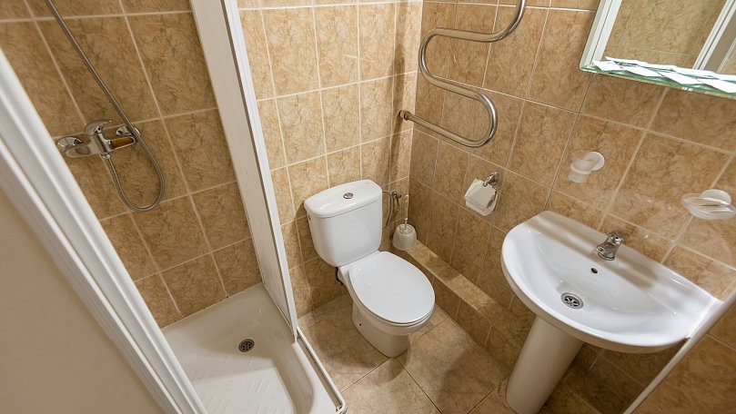 Санузел: Санузел с душем, унитазом и умывальником.