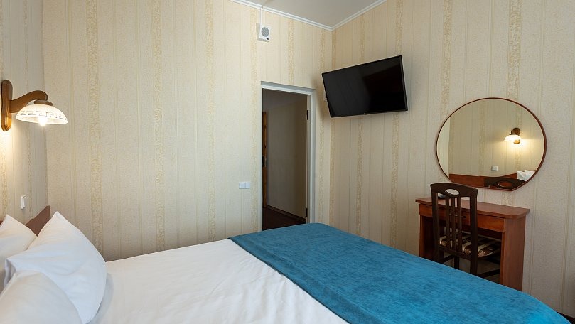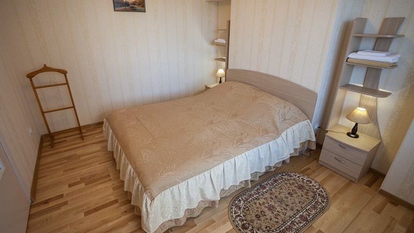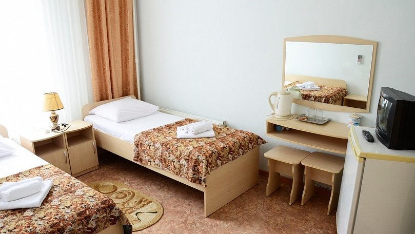 Мебель: Две односпальные или одна двуспальная кровать, стулья, тумбы, шкаф для одежды, вешалки, зеркало, сушилка для белья.