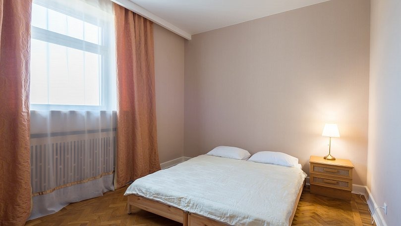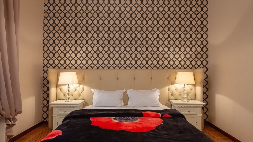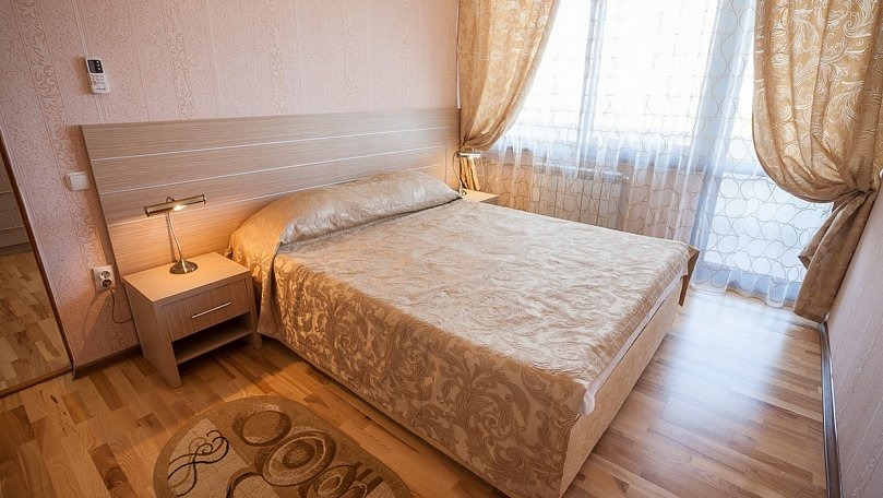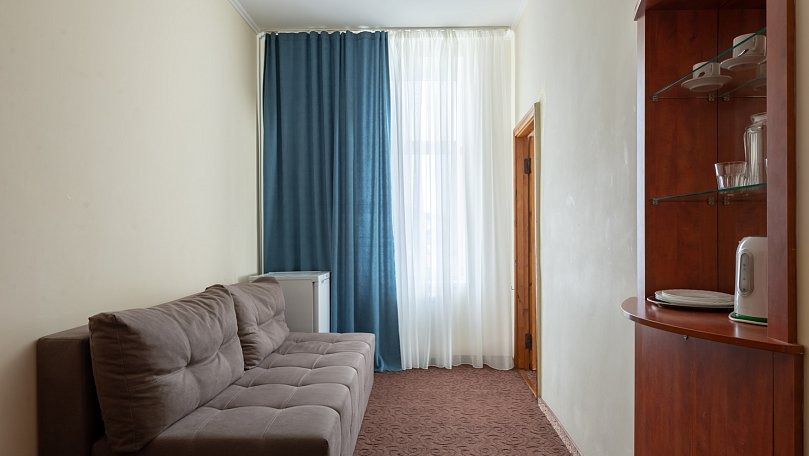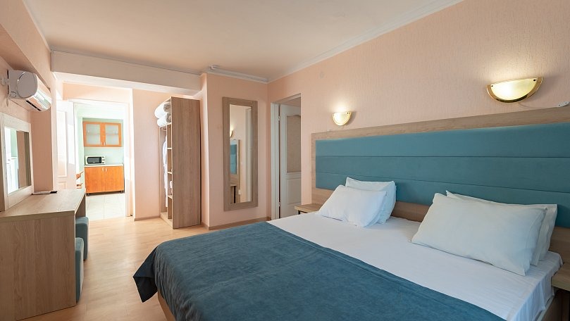Мебель: Две односпальные или одна двуспальная кровать, прикроватные тумбы, шкаф для одежды, раскладной диван.