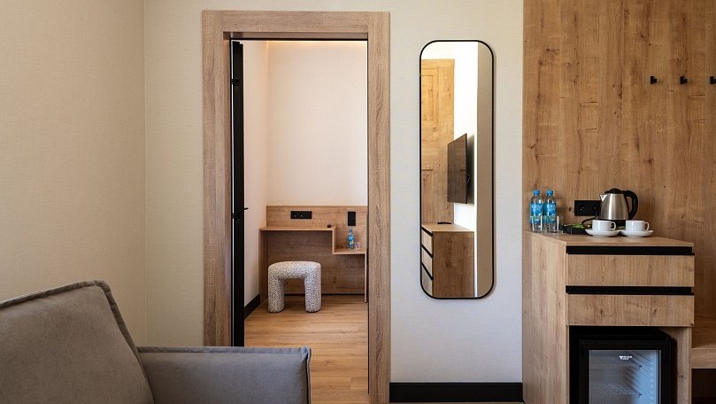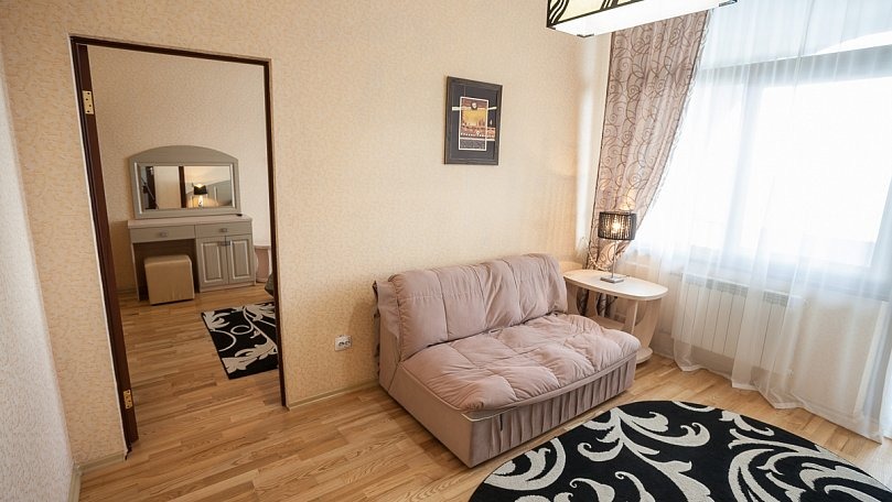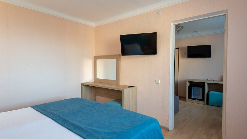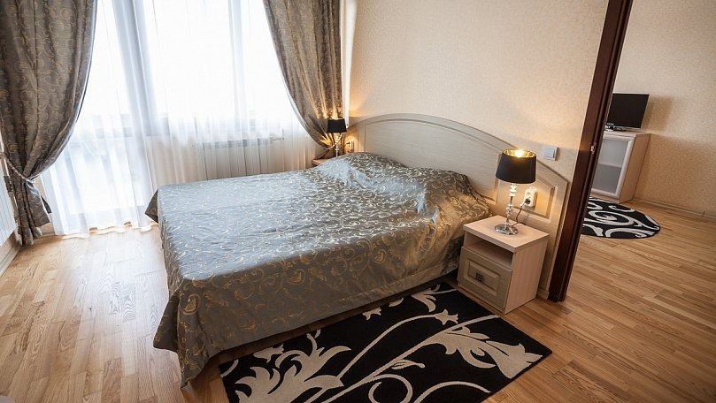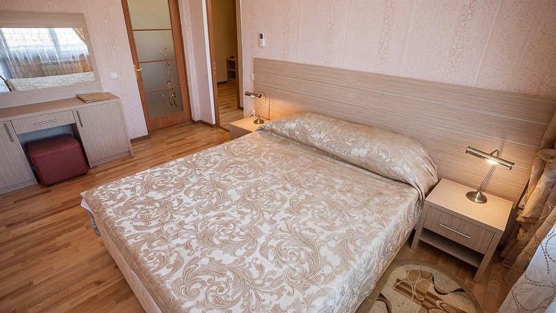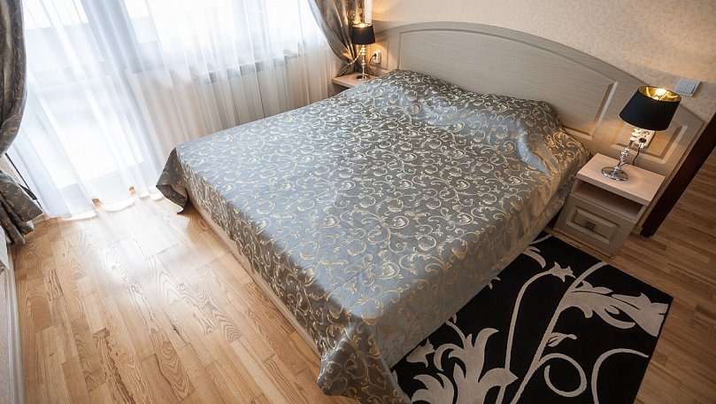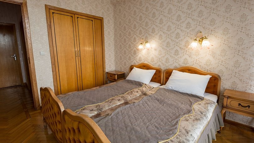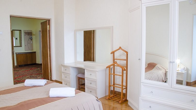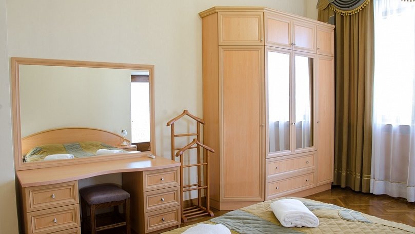 Мебель: Две раздельные кровати или одна двуспальная кровать, раскладной диван, кресла, стол, стулья, тумбы, туалетный столик, шкаф для одежды, вешалки, зеркало, ковер, сушилка для белья.