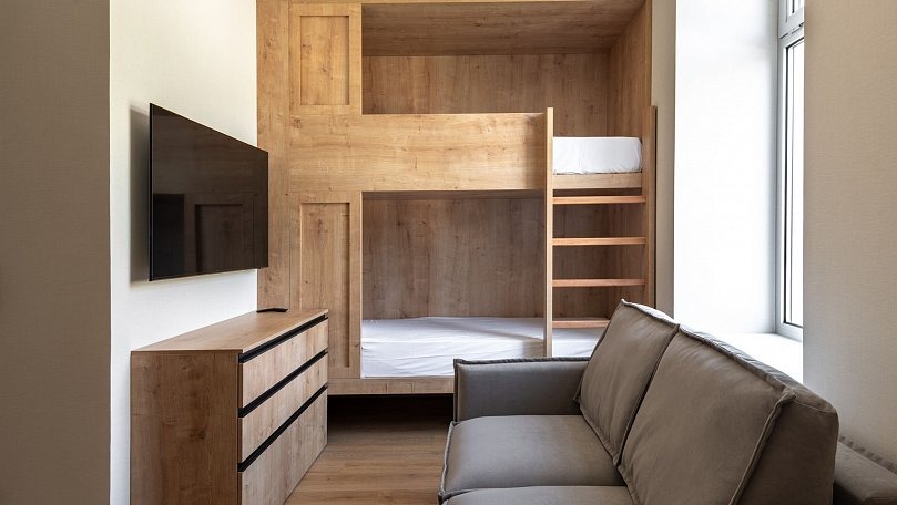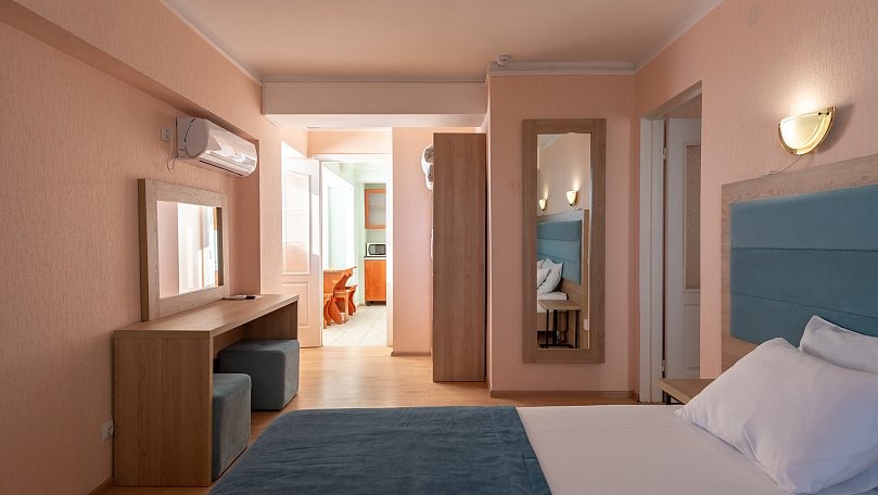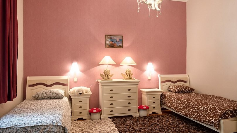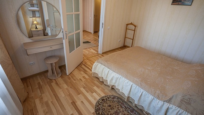 Мебель: Двуспальная кровать, двухъярусная кровать, тумбы, шкаф для одежды, туалетный столик, мягкая мебель, вешалки, зеркало.