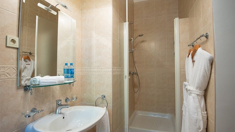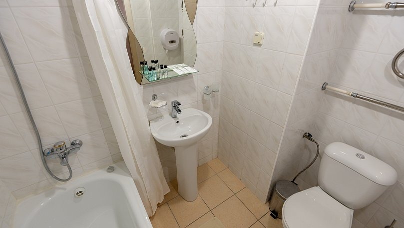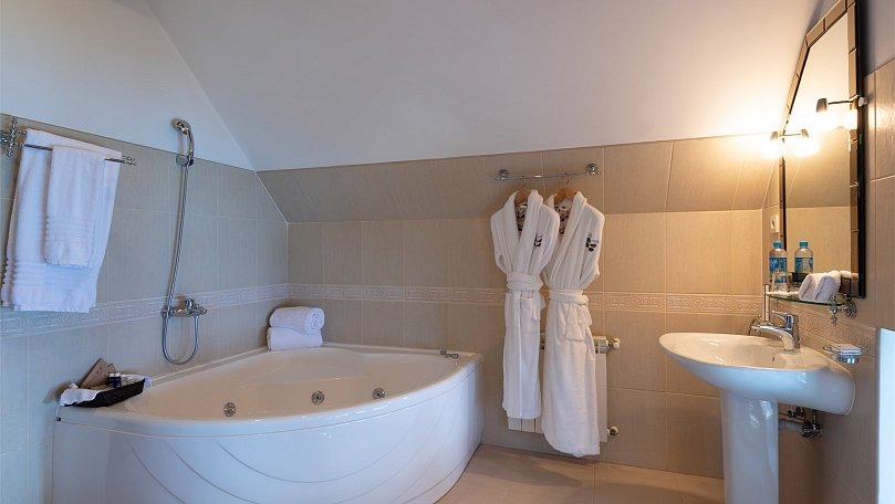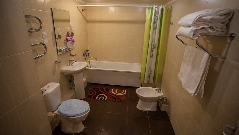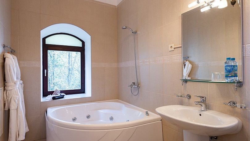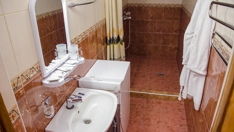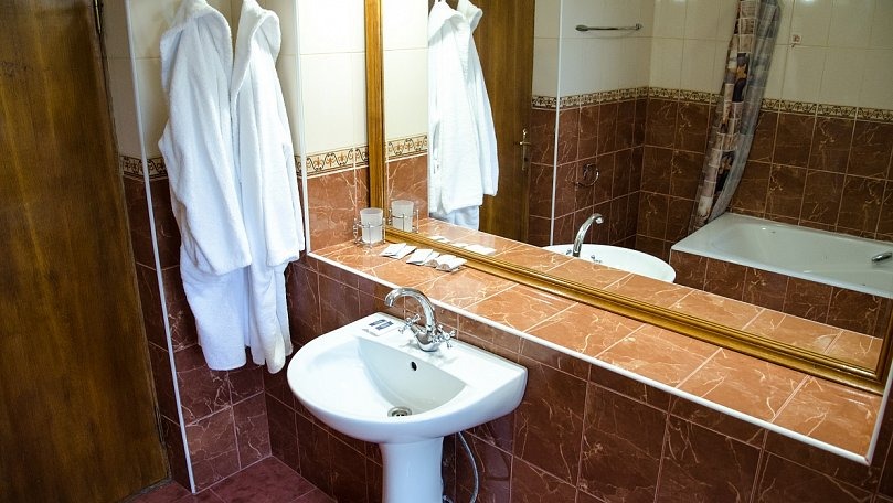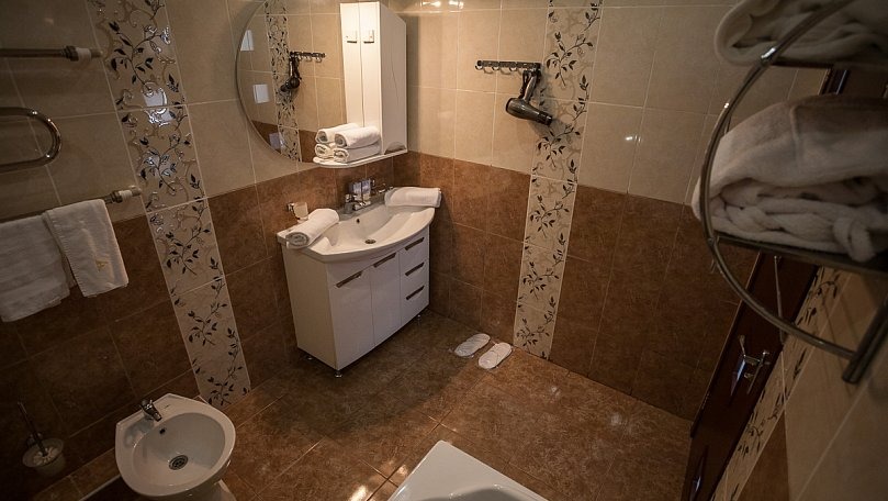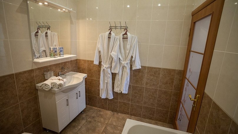 Сервис: Полотенца (для лица, для ног, банное), халаты и тапочки, гигиенические средства, набор мини-парфюмерии при заезде, фен.