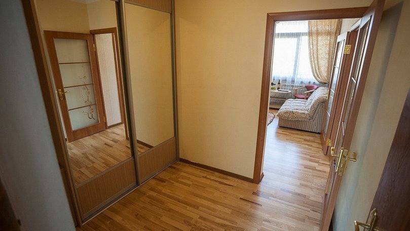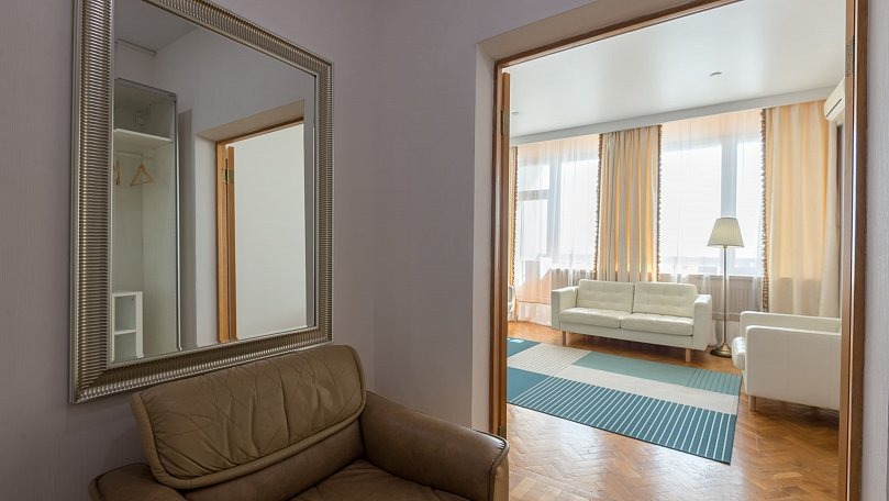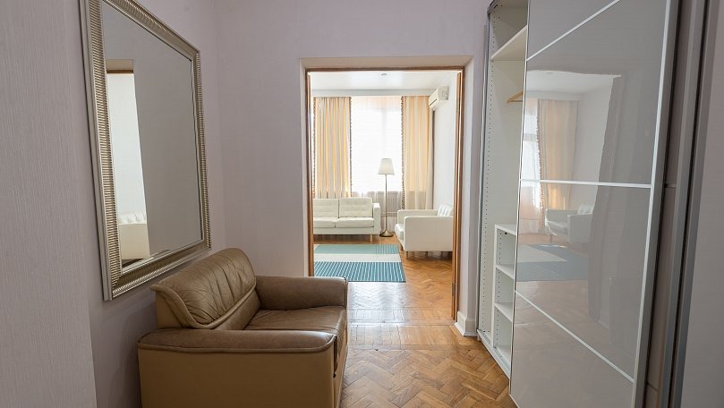 Мебель: Две двуспальные кровати, мягкая мебель, кресло, стулья, журнальный столик, комод, шкаф для одежды, вешалки, зеркало, сушилка для белья.