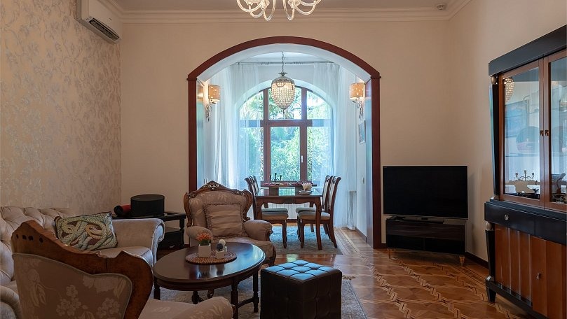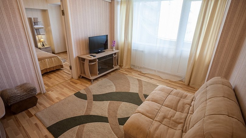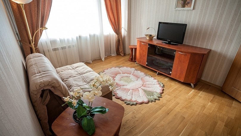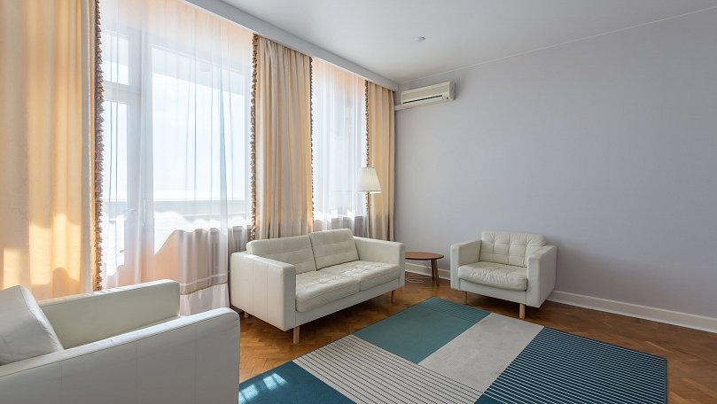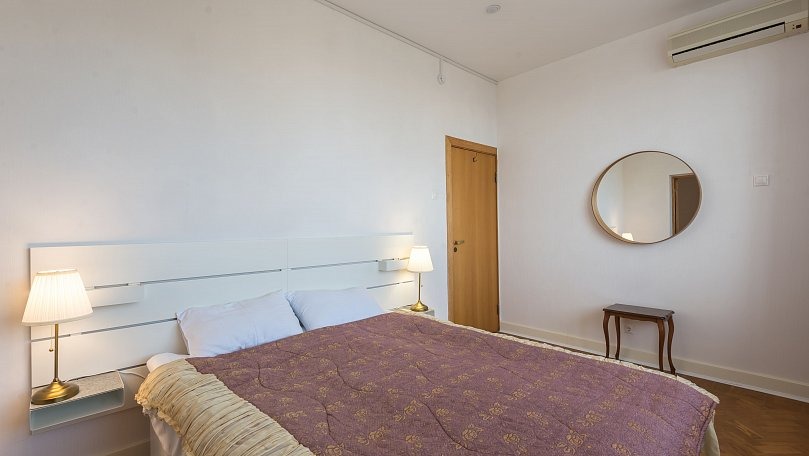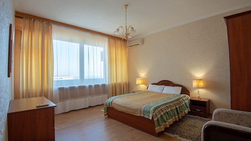 Мебель: Двуспальная кровать, прикроватные тумбы, шкаф для одежды, раскладной диван, журнальный столик, сервант для посуды.