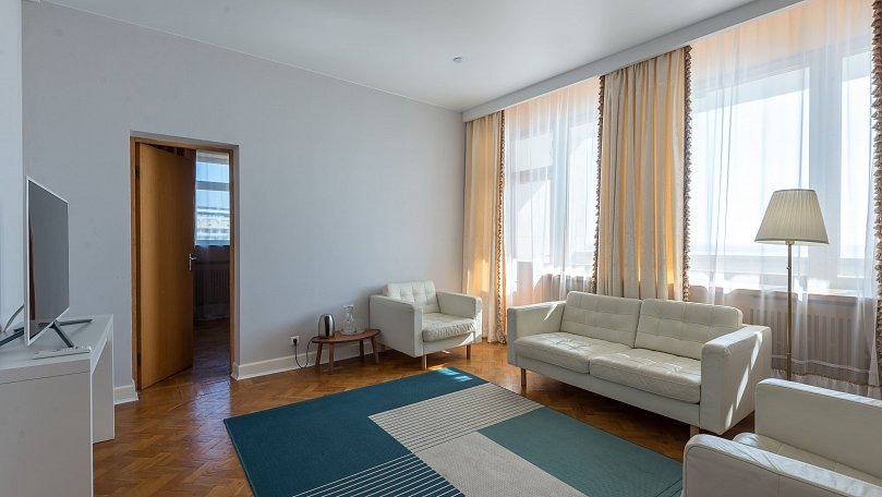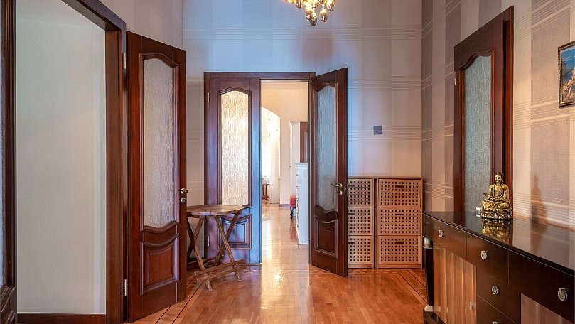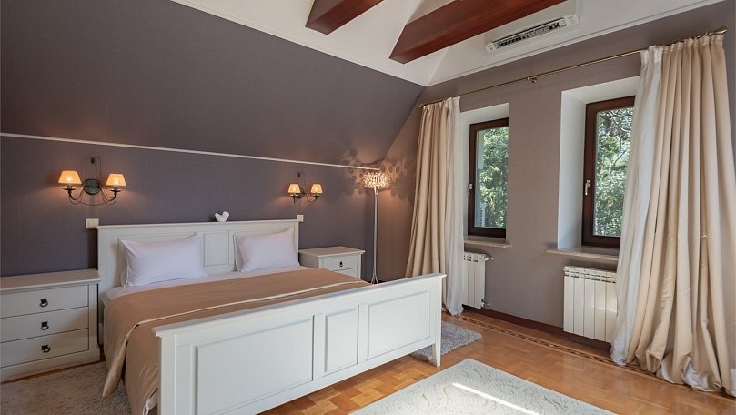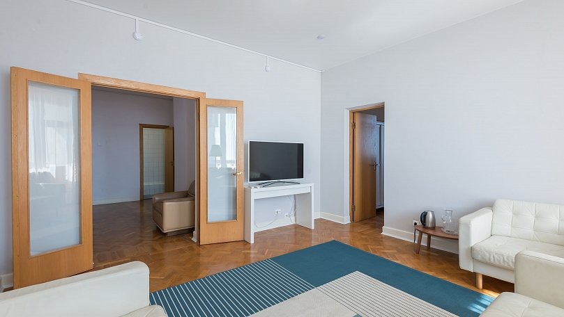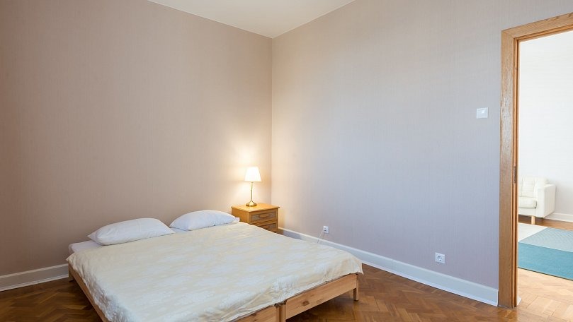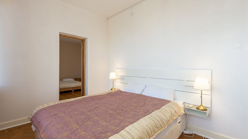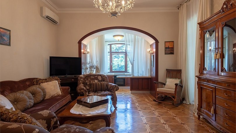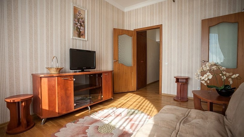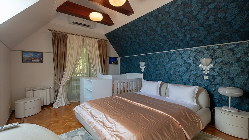 Мебель: Двуспальная кровать, прикроватные тумбы, шкаф для одежды, комод, раскладной диван, журнальный столик, сервант для посуды.