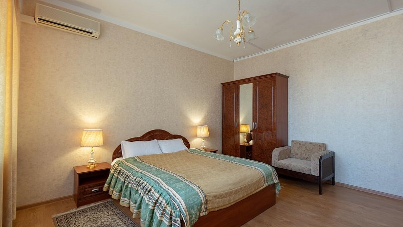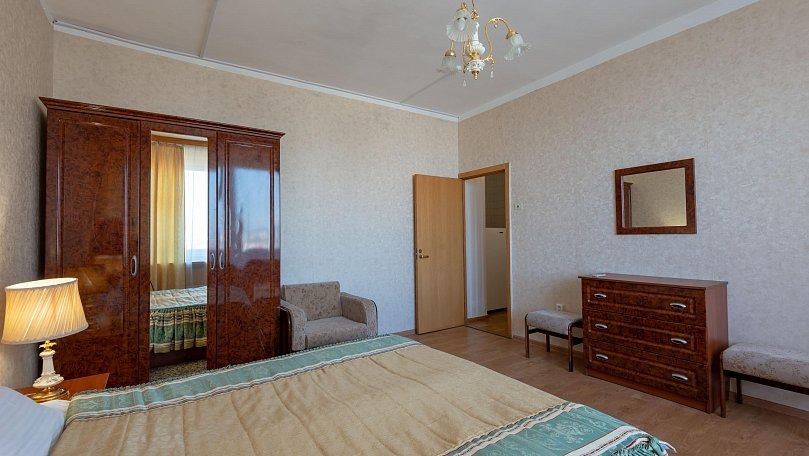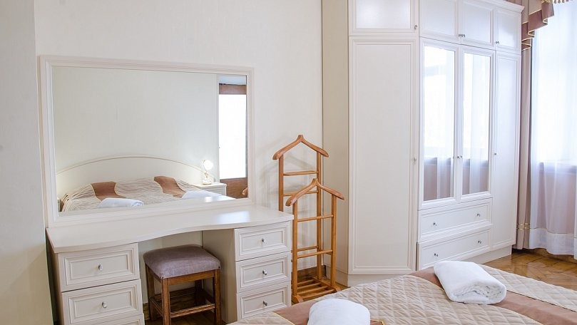 Мебель: Две раздельные или одна двуспальная кровать, кресло, стулья, тумбы, шкаф для одежды, зеркало, сушилка для белья.