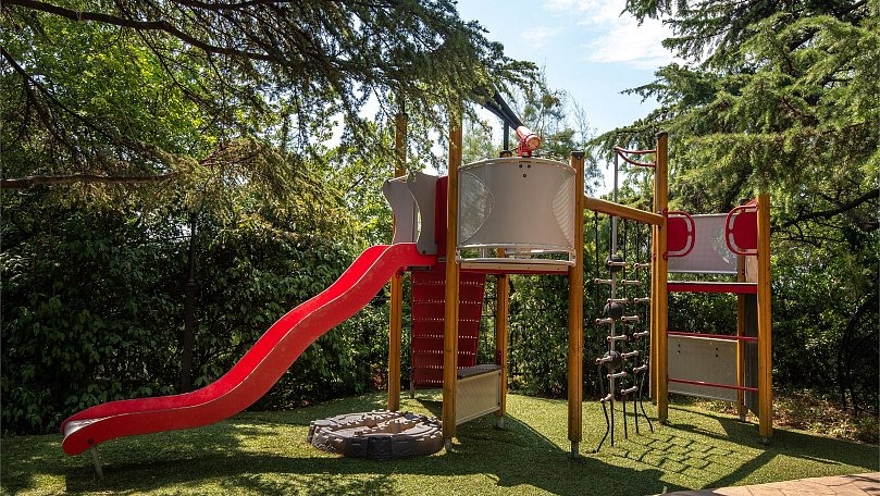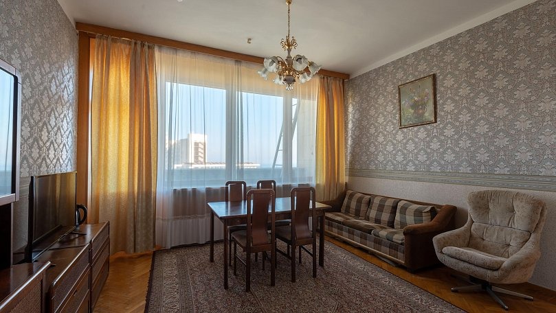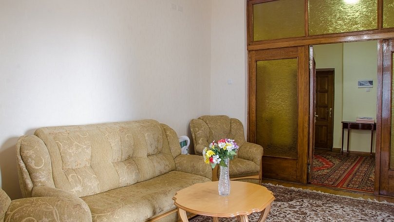 Мебель: Четыре односпальные кровати, раскладной диван, кресла, стол, стулья, тумбы, туалетный столик, шкаф для одежды, вешалки, зеркало, ковер, сушилка для белья.