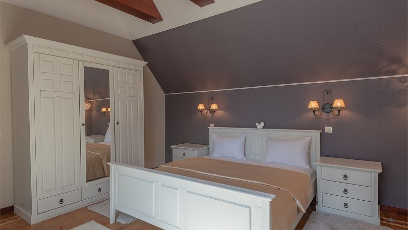 Мебель: Двуспальная кровать или две односпальные кровати, мягкая мебель, кресла, стол, стулья, тумбы, туалетный столик, шкаф для одежды, вешалки, зеркало, ковер, сушилка для белья.