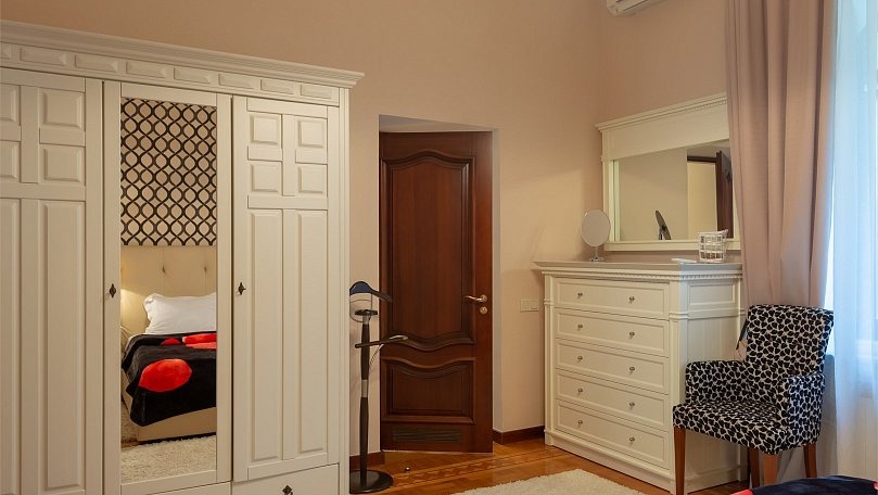 Мебель: Двуспальная кровать, мягкая мебель (диван), кресло, стол, стулья, багажная тумба, пуфик, туалетный столик, шкаф для одежды, вешалки, зеркало, ковер, сушилка для белья.