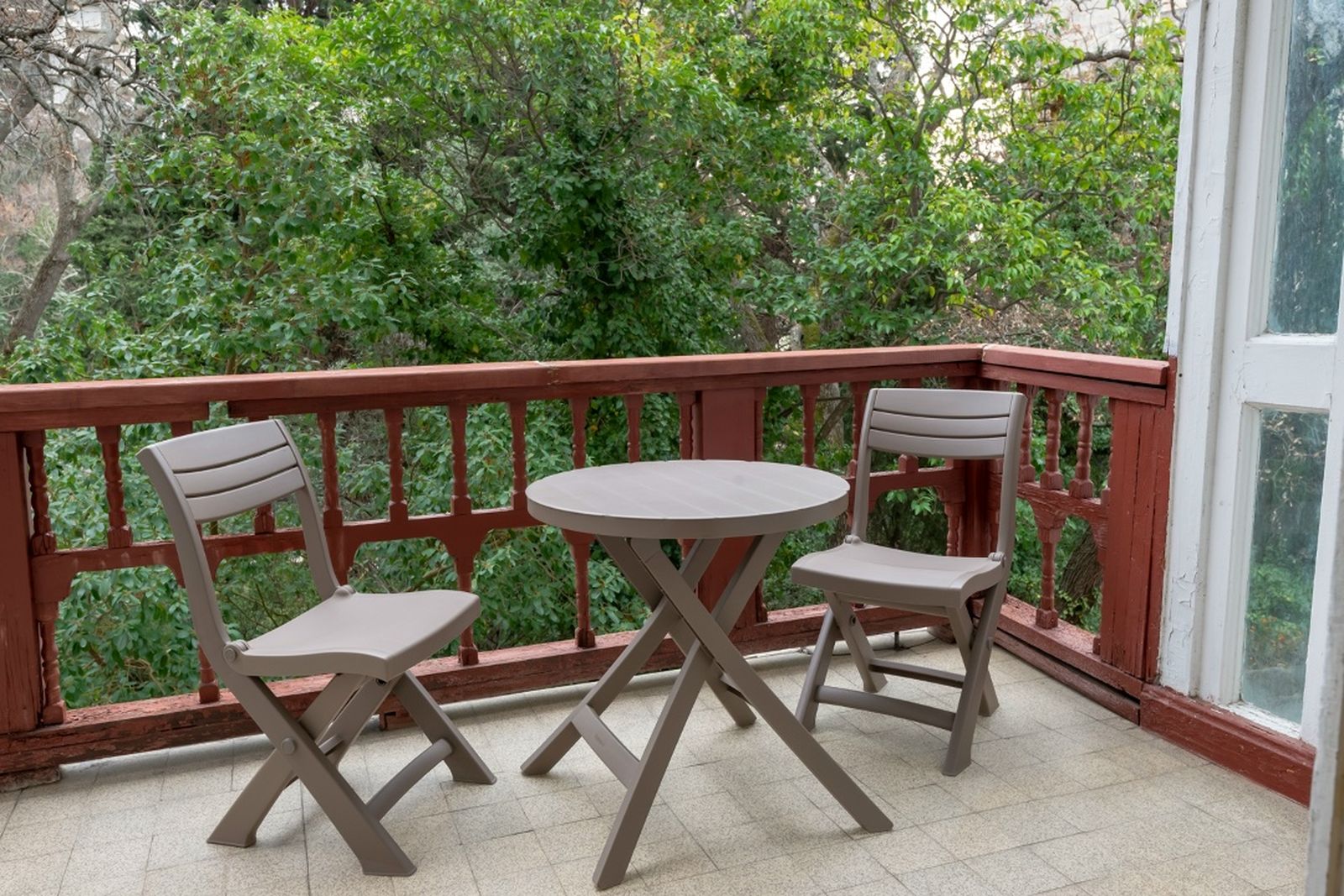 Мебель: Две односпальные или одна двуспальная кровать, раскладной диван, тумбы, туалетный столик, шкаф для одежды, вешалки, зеркало, сушилка для белья.