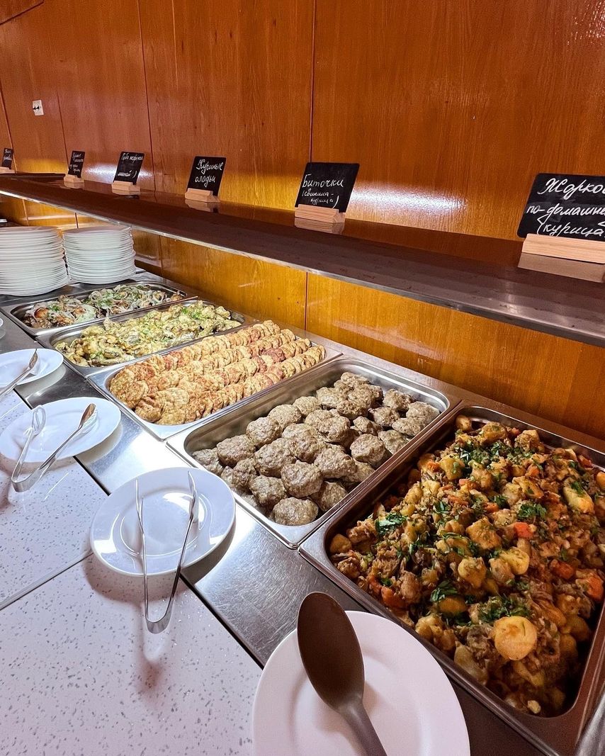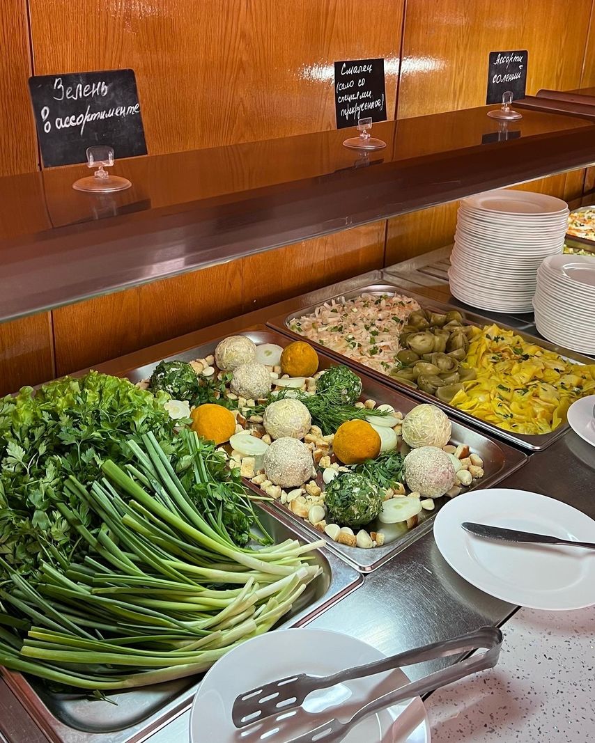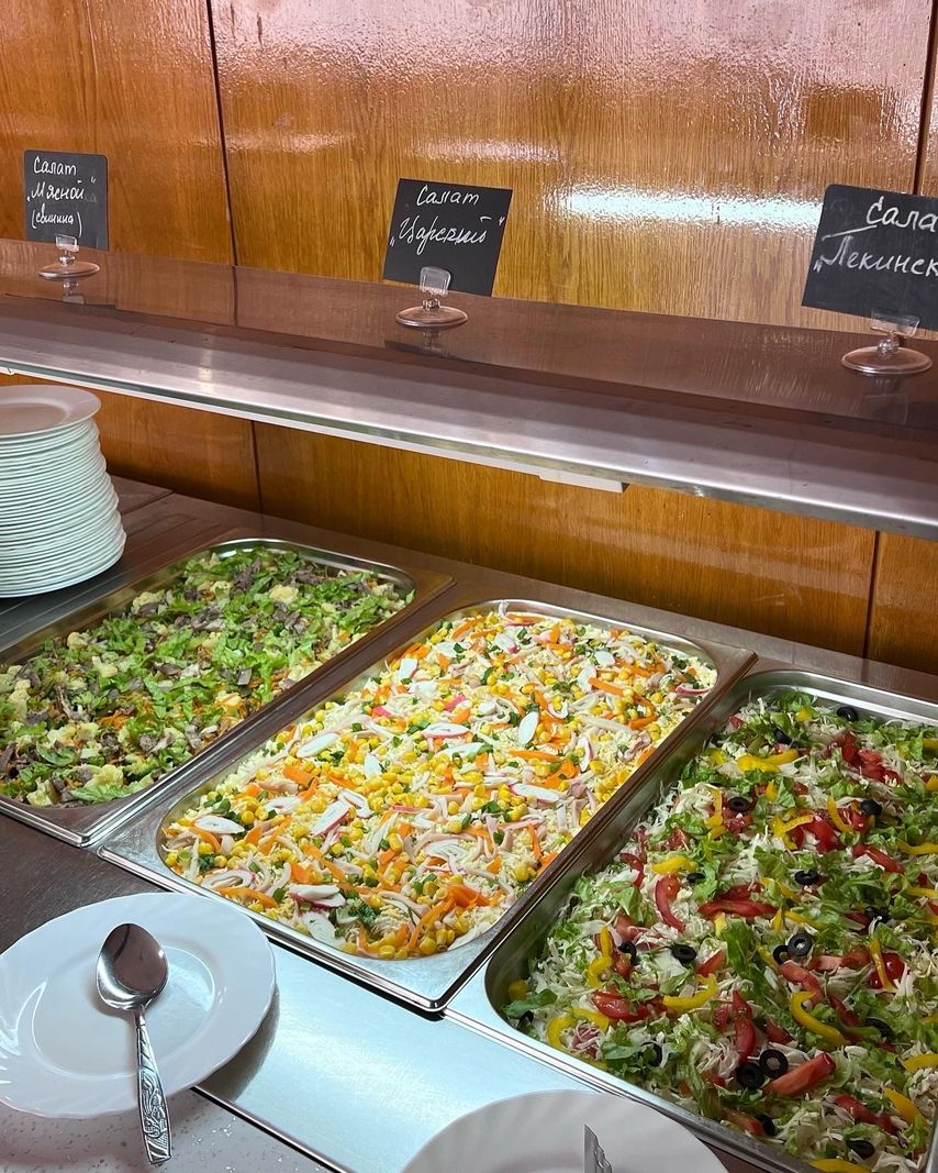 Меню включает салаты, свежие овощи, фрукты, выпечку, различные горячие блюда, в том числе отварные и запеченые, что позволяет соблюдать лечебную диету. Температура горячих блюд поддерживается с помощью тепловых мармитов. Залы ресторана оборудованы кондиционерами.