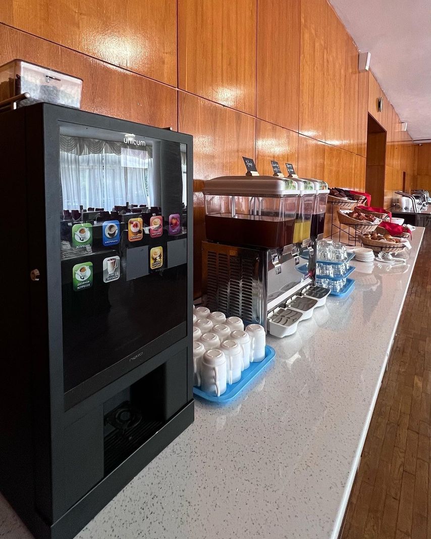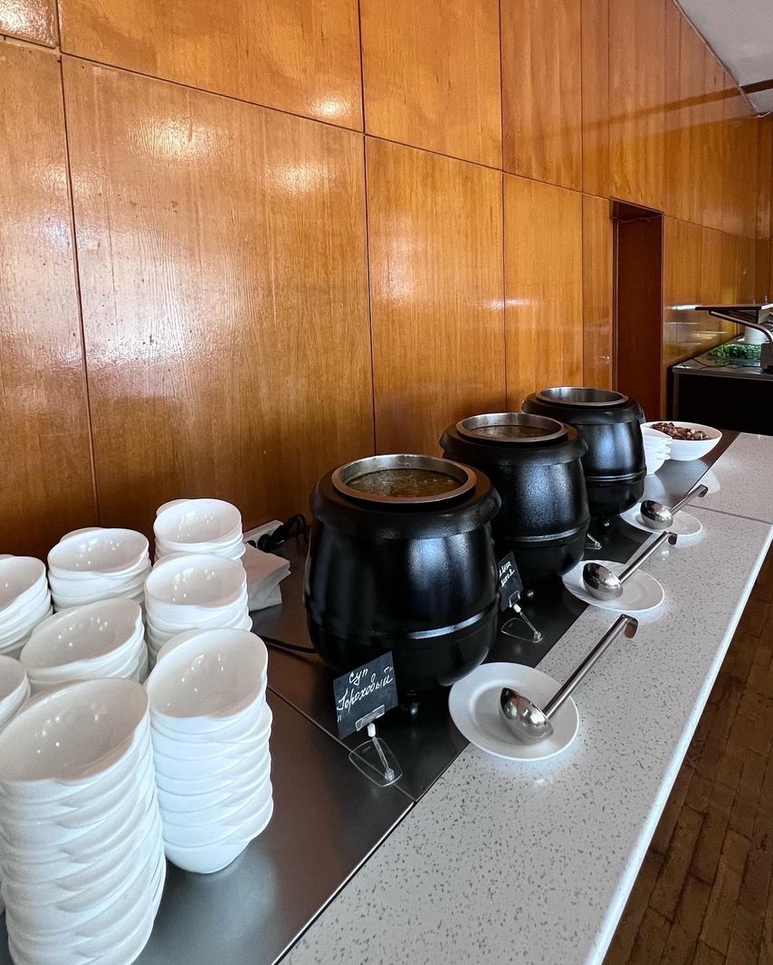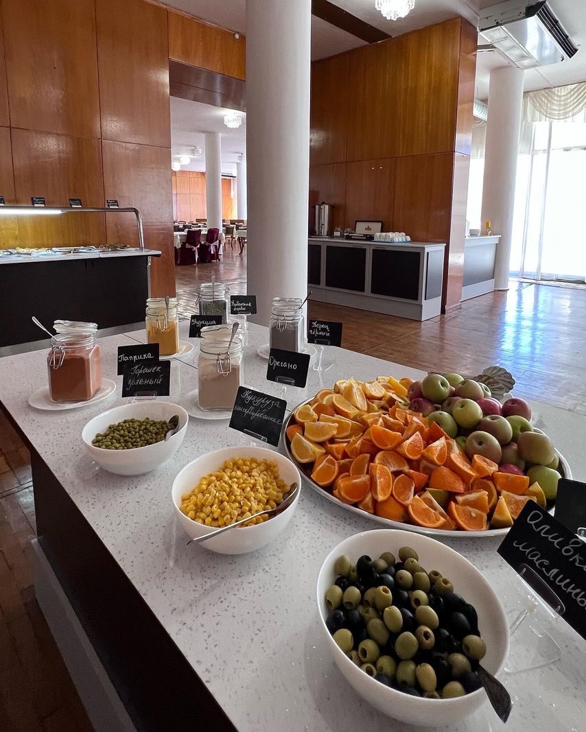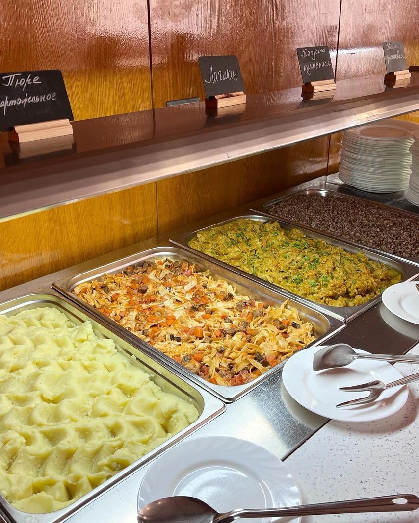 Меню включает салаты, свежие овощи, фрукты, выпечку, различные горячие блюда, в том числе отварные и запеченые, что позволяет соблюдать лечебную диету. Температура горячих блюд поддерживается с помощью тепловых мармитов. Залы ресторана оборудованы кондиционерами.