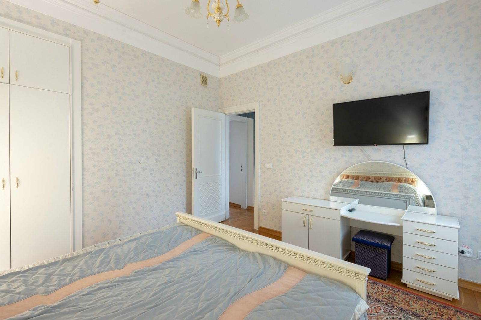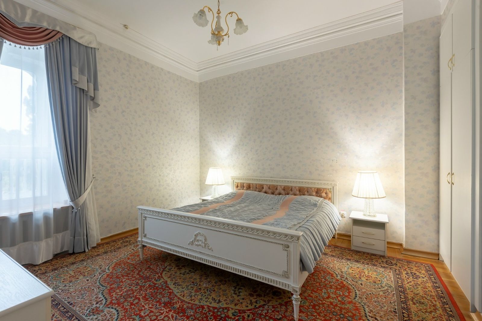 Мебель: Двуспальная кровать (или две односпальные), раскладной диван, тумбы, туалетный столик, шкаф для одежды, вешалки, зеркало, ковер, сушилка для белья.