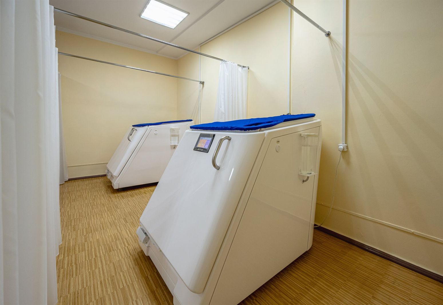 - целебные ванны — пароуглекислые на «OKKERVIL-COMBI PUV EU» и пузырьковые (жемчужные) с хвоей, йодо-бромом, бишофитом, каштаном, салицилатами, валерианой, ромашкой, спирулиной;