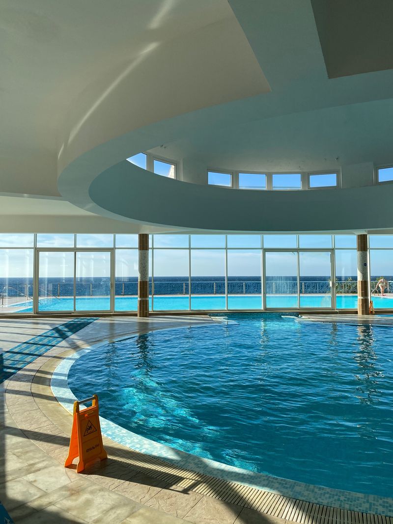 Крытый бассейн оборудован душевыми, а его панорамное остекление позволяет любоваться прекрасным окресным пейзажем.