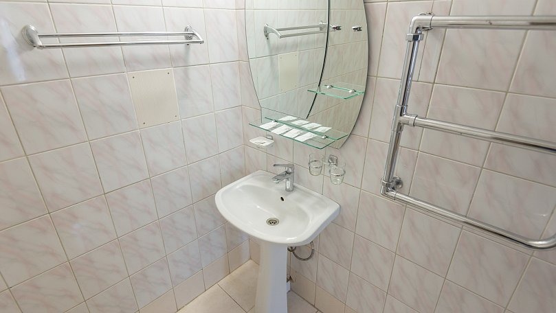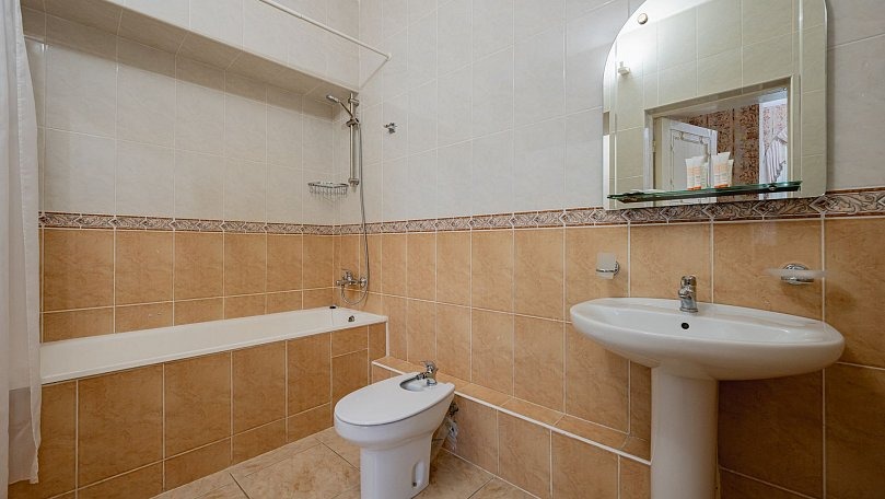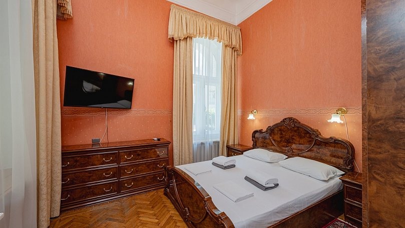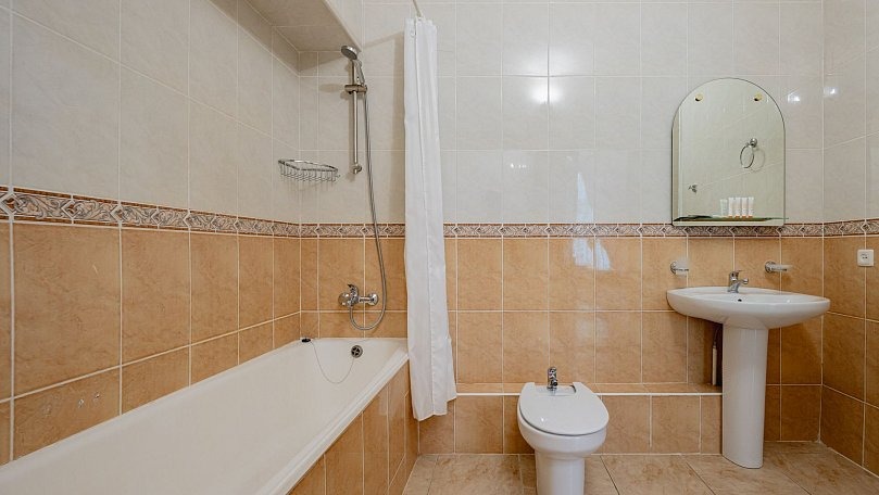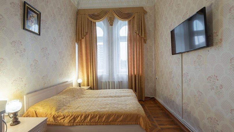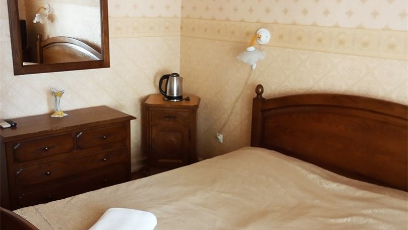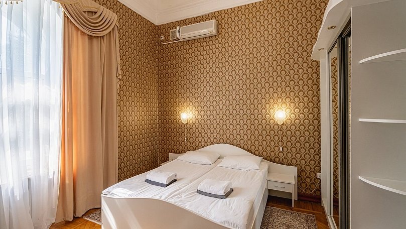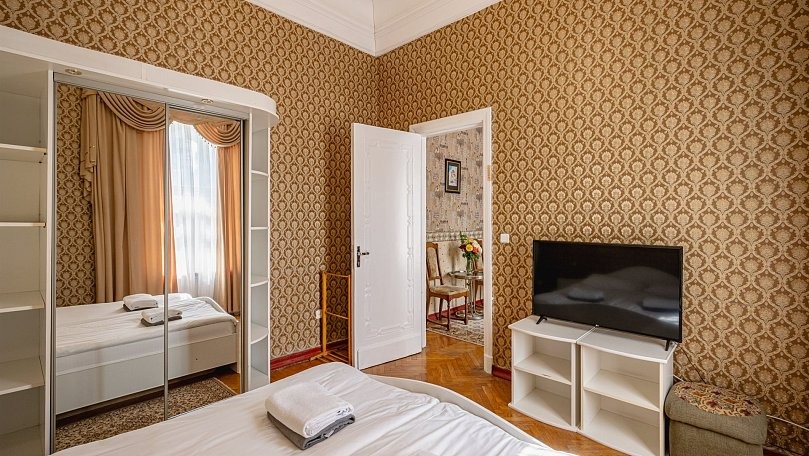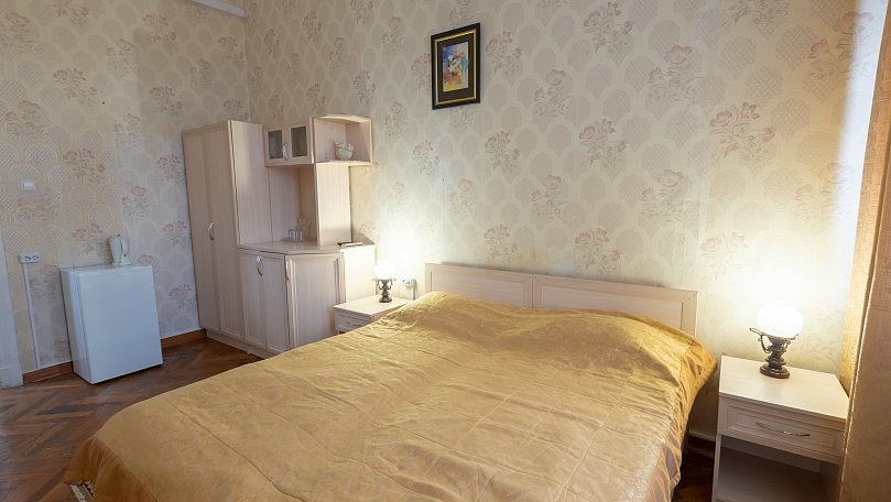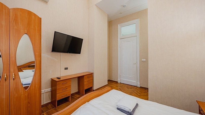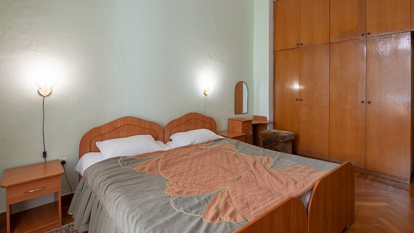 Мебель: Две односпальные или одна двуспальная кровать, диван, тумбы, туалетный столик, шкаф для одежды, вешалки, зеркало, сушилка для белья.