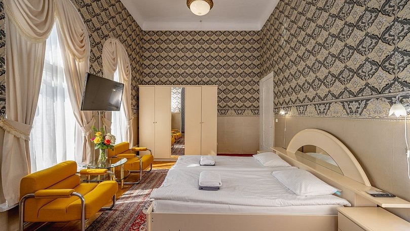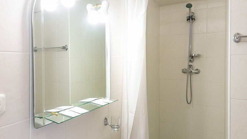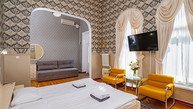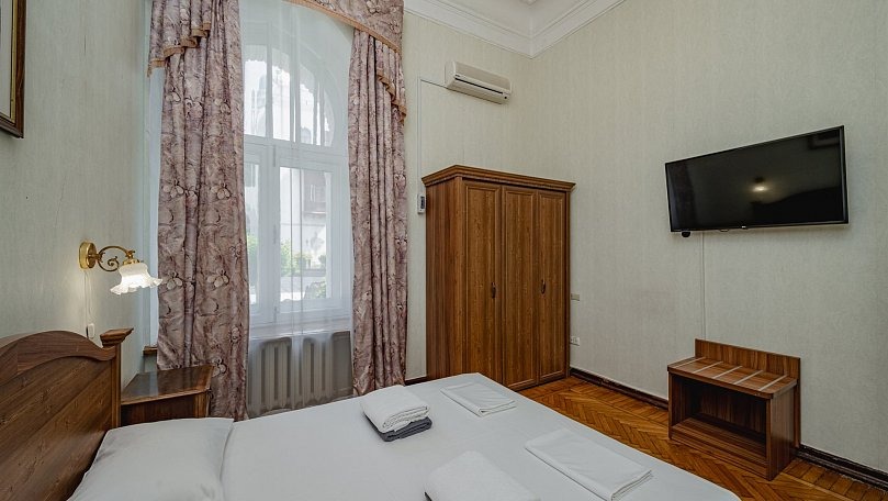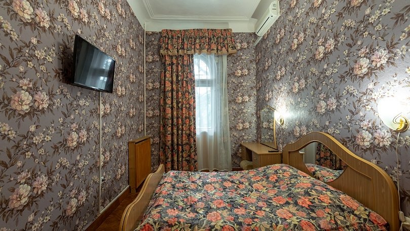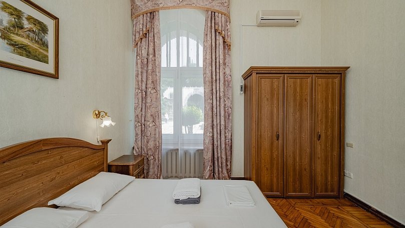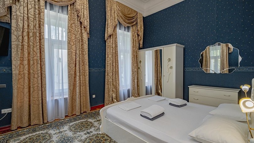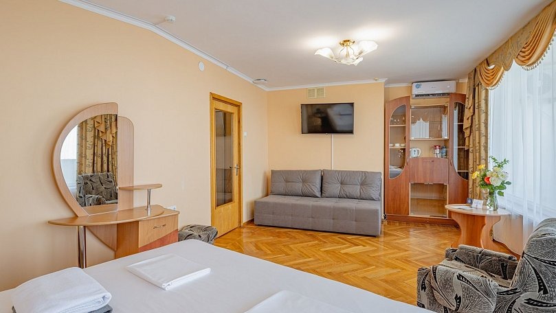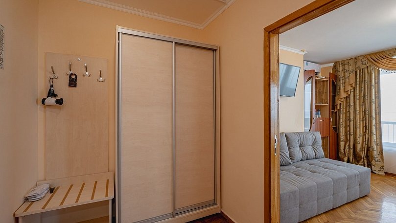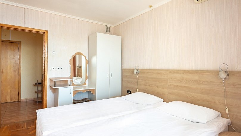 Мебель: Две односпальные или одна двуспальная кровать, раскладной диван, тумбы, туалетный столик, шкаф для одежды, вешалки, зеркало, сушилка для белья.