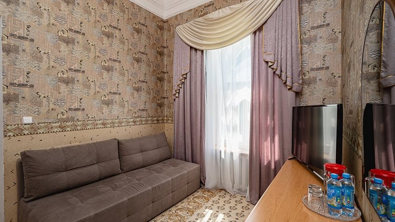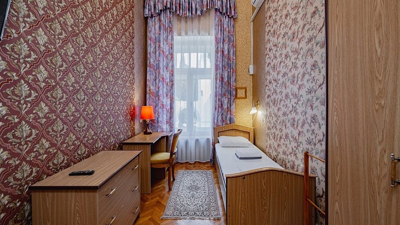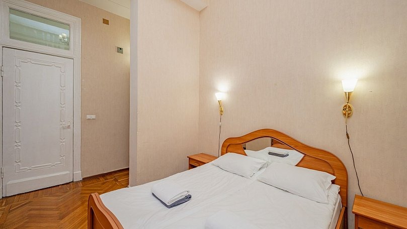 Мебель: Две односпальные или одна двуспальная кровать, диван, шкаф для одежды, вешалки, зеркало.