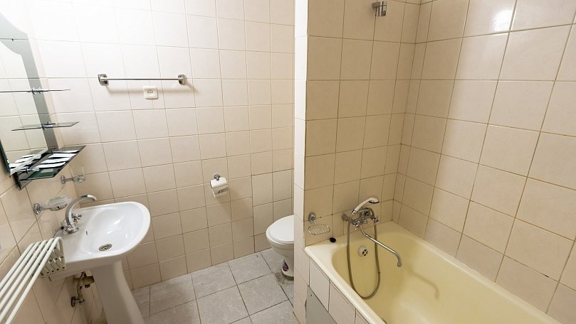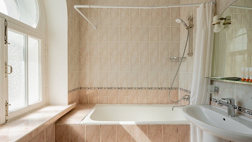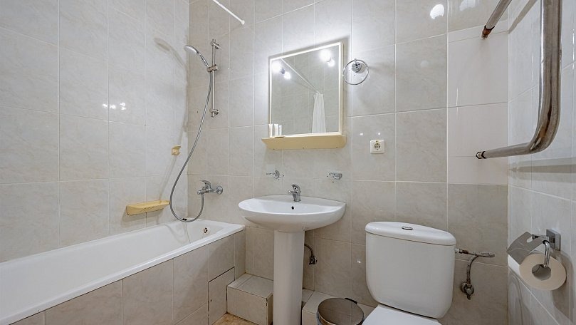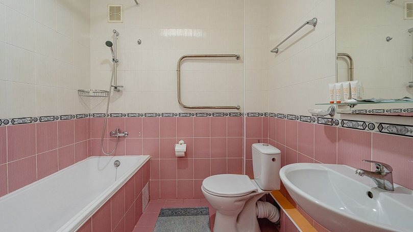 Санузел: Санузел с ванной или душем, унитазом и раковиной.