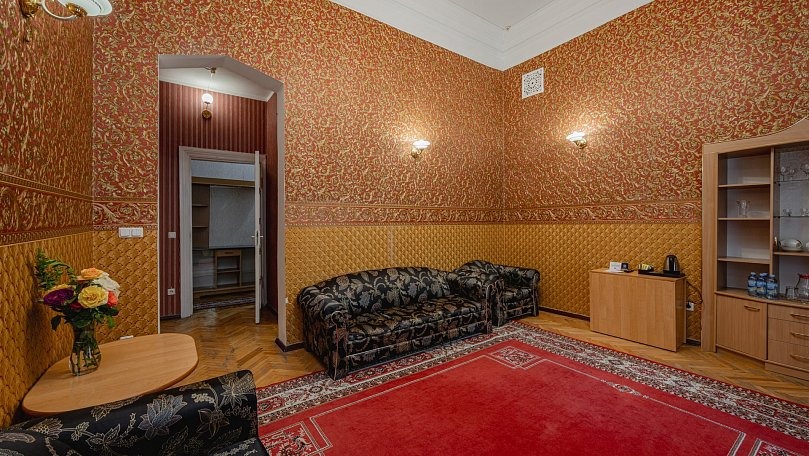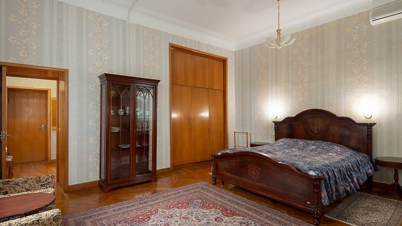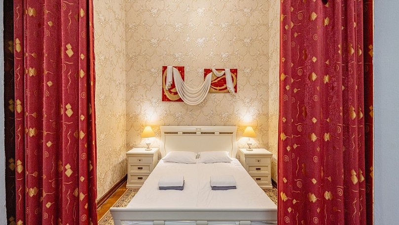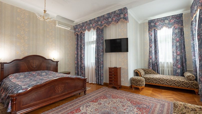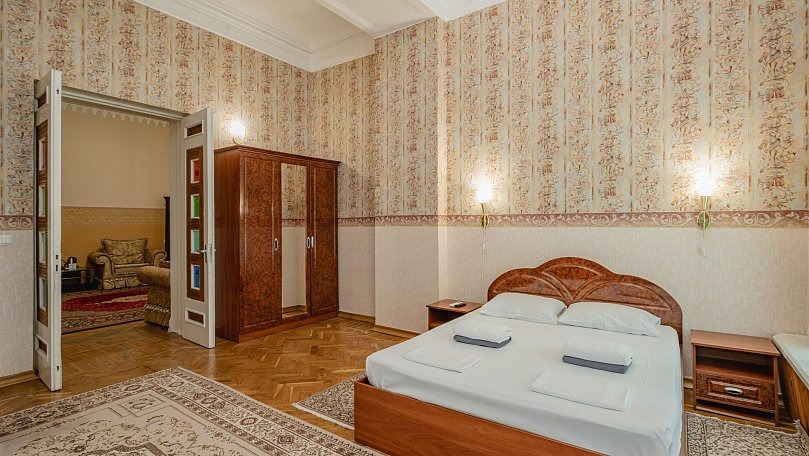 Мебель: Двуспальная кровать (или две односпальные), раскладной диван, тумбы, туалетный столик, шкаф для одежды, вешалки, зеркало, ковер, сушилка для белья.