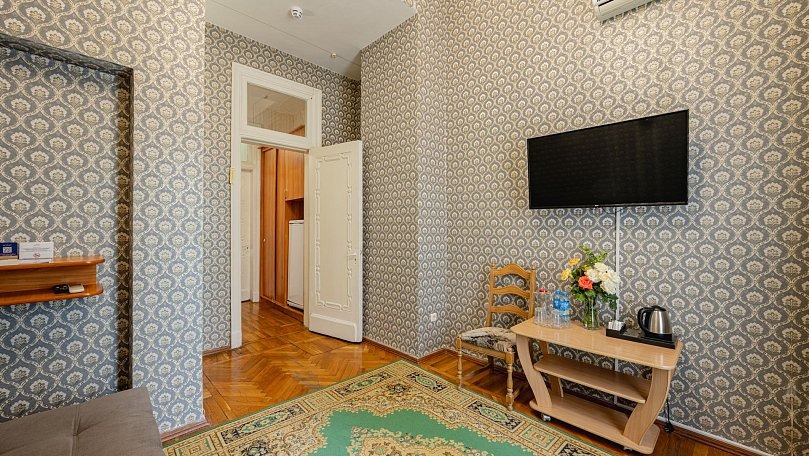 Оборудование: Кондиционер, отопление, телевизор, кабельное ТВ, холодильник, чайник, чайный набор, набор посуды, светильник, Wi-Fi в общественных зонах, кулер в холле.