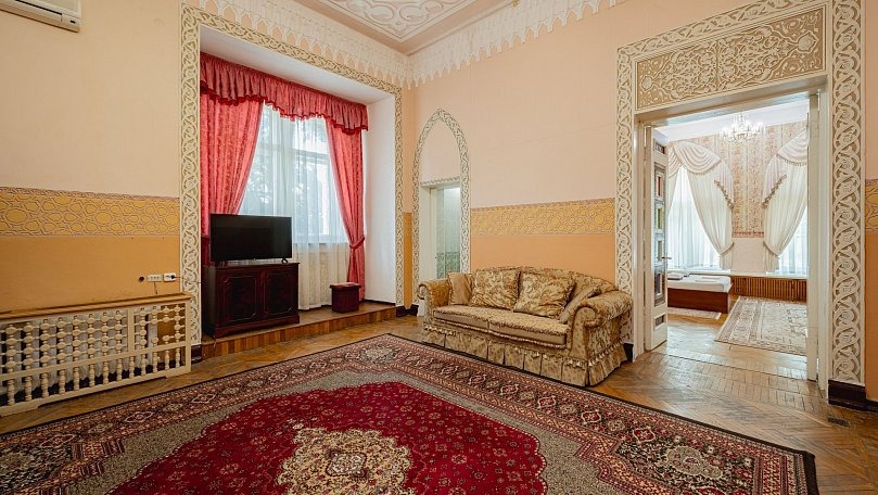Мебель: Две двуспальные кровати, одна односпальная кровать, диван-кровать, тумбы, туалетный столик, шкаф для одежды, вешалки, зеркало, ковер, сушилка для белья.