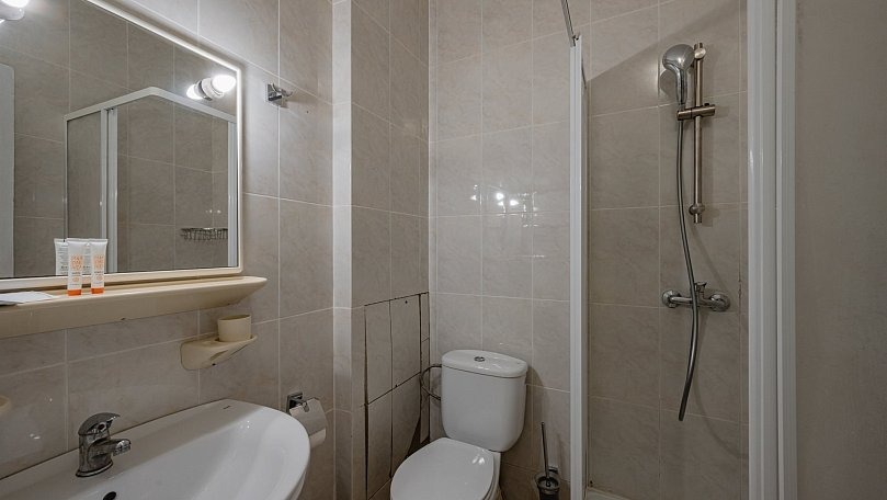 Санузел: Санузел с душем, унитазом и раковиной.
