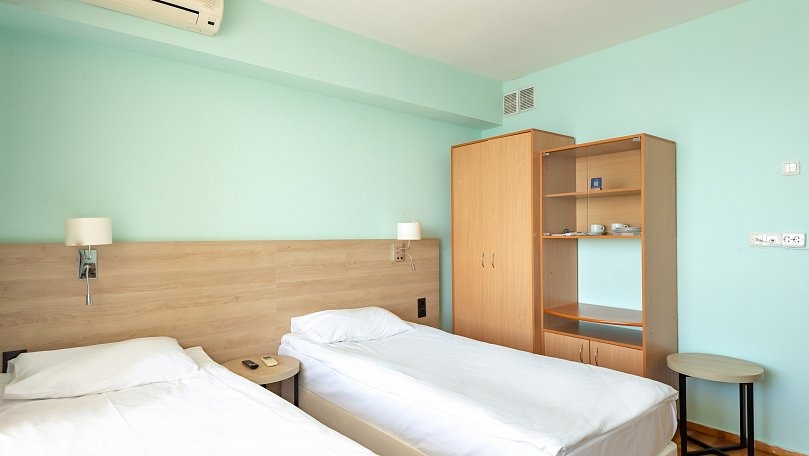 Мебель: Две односпальные кровати, раскладное кресло, тумбы, туалетный столик, шкаф для одежды, вешалки, зеркало, сушилка для белья.