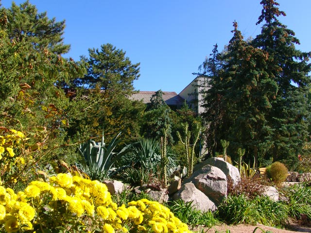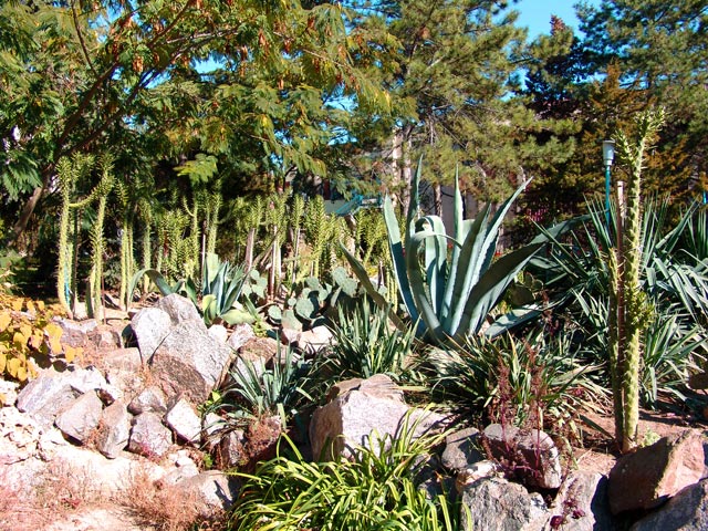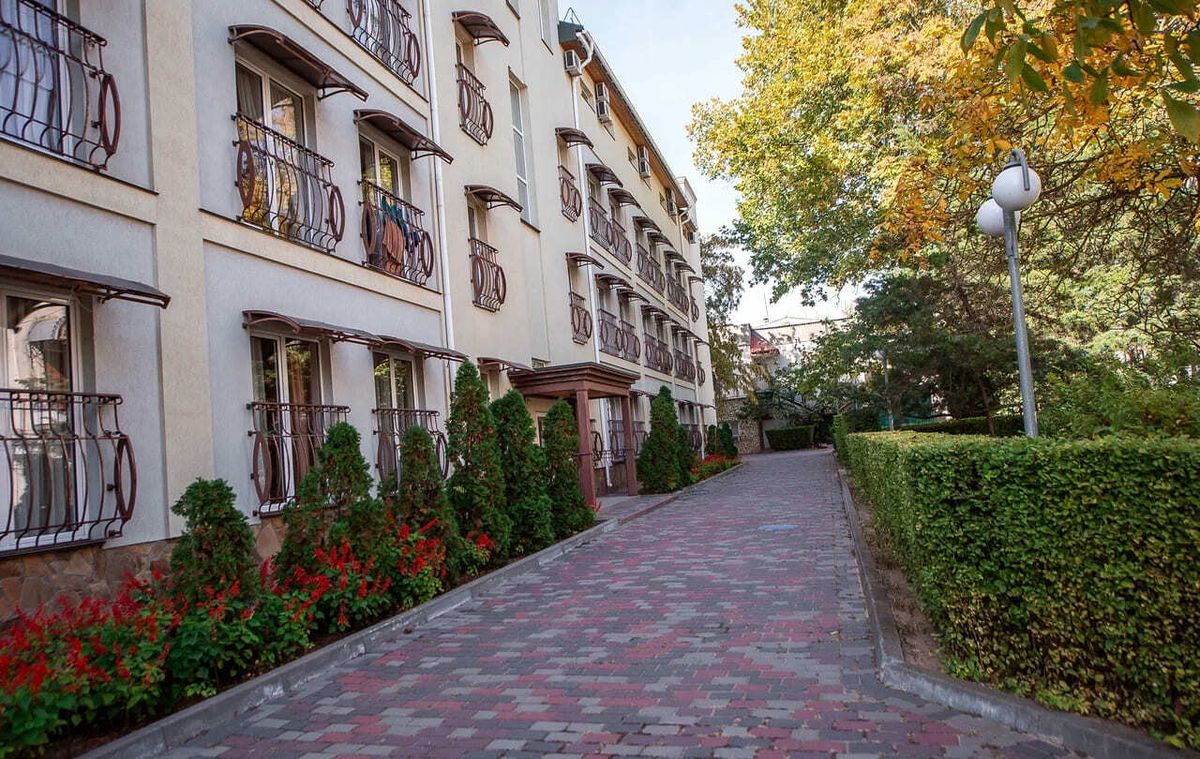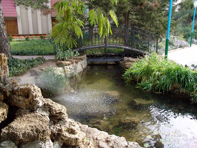 Обширная парковая территория 6 га с 500 видами растений из Никитского ботанического сада, тенистыми аллеями и ровными дорожками — удобно для прогулок и терренкура