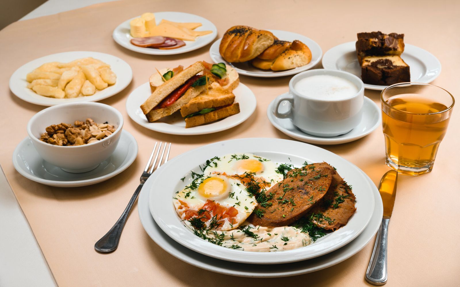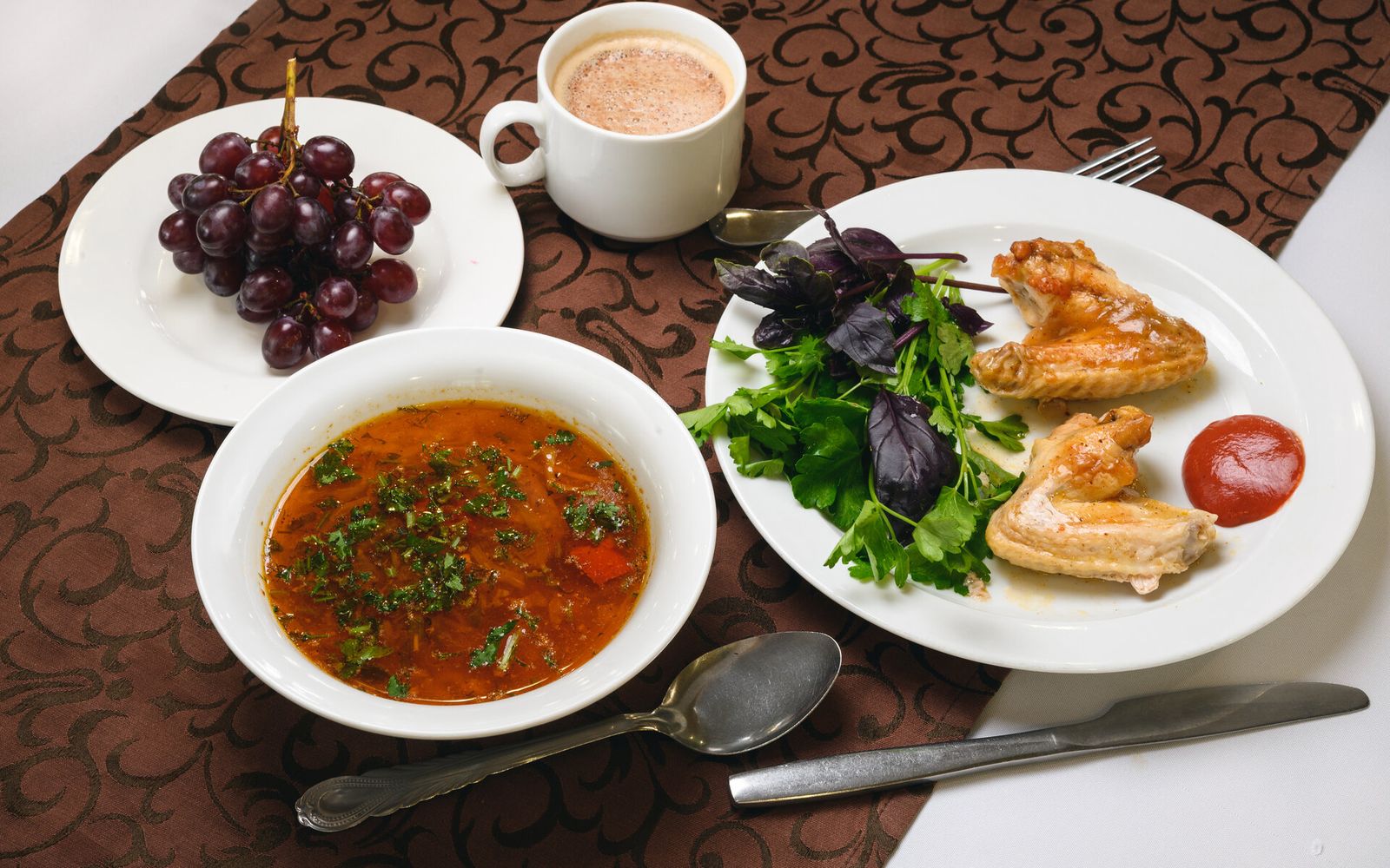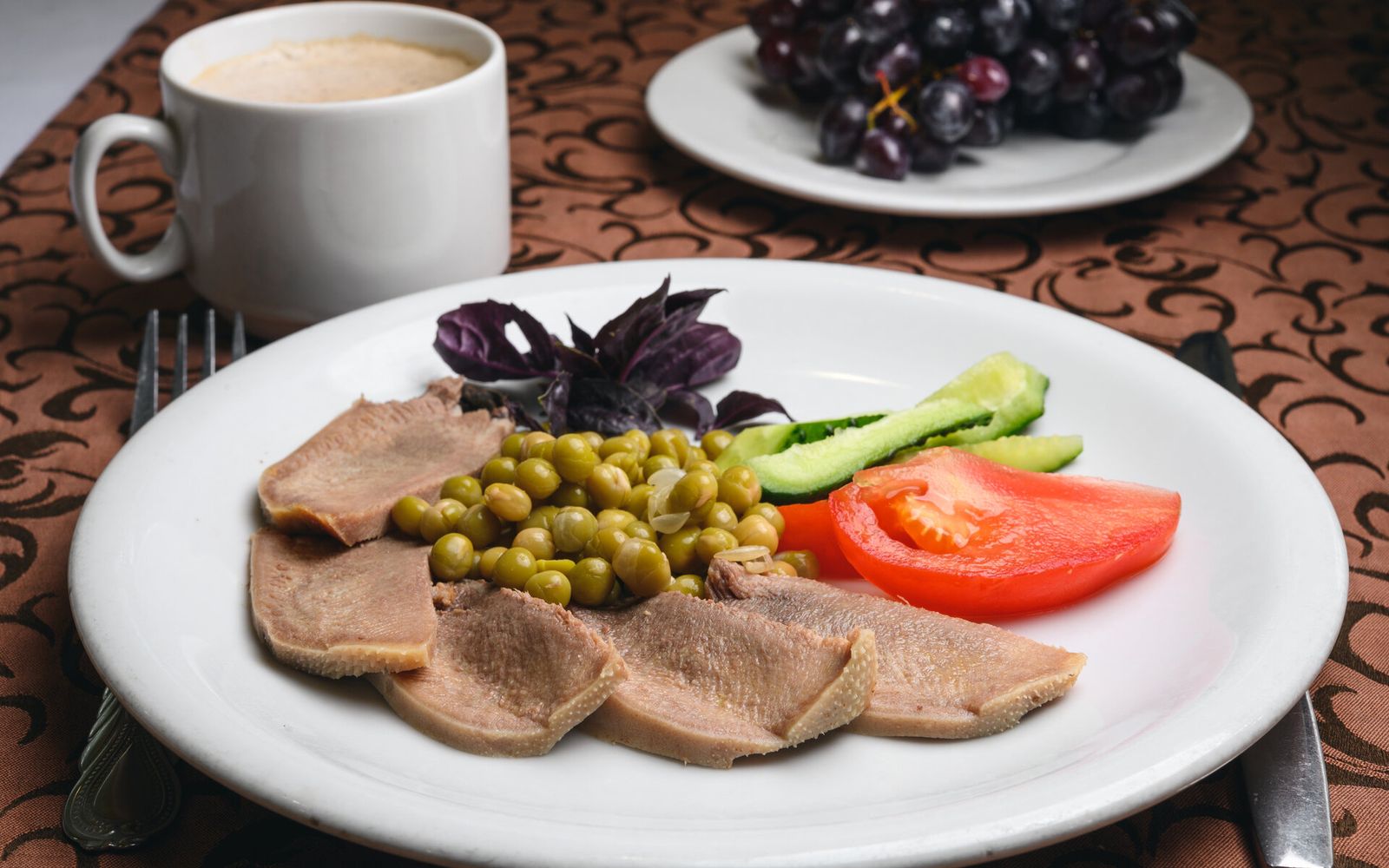 В ежедневном меню всегда есть позиции для различных диет. Дополнительно гостям предлагается фиточаи, компоты, соки, чай, кофе, какао.
