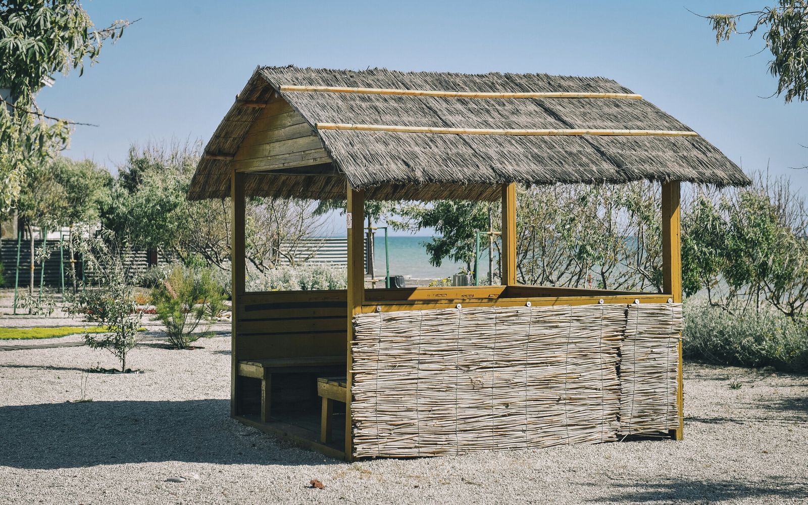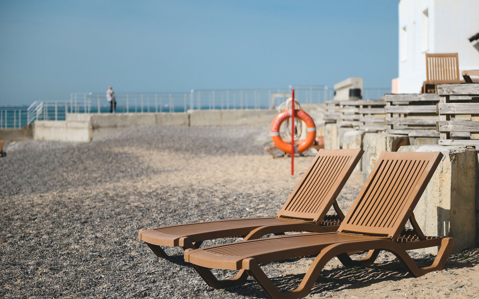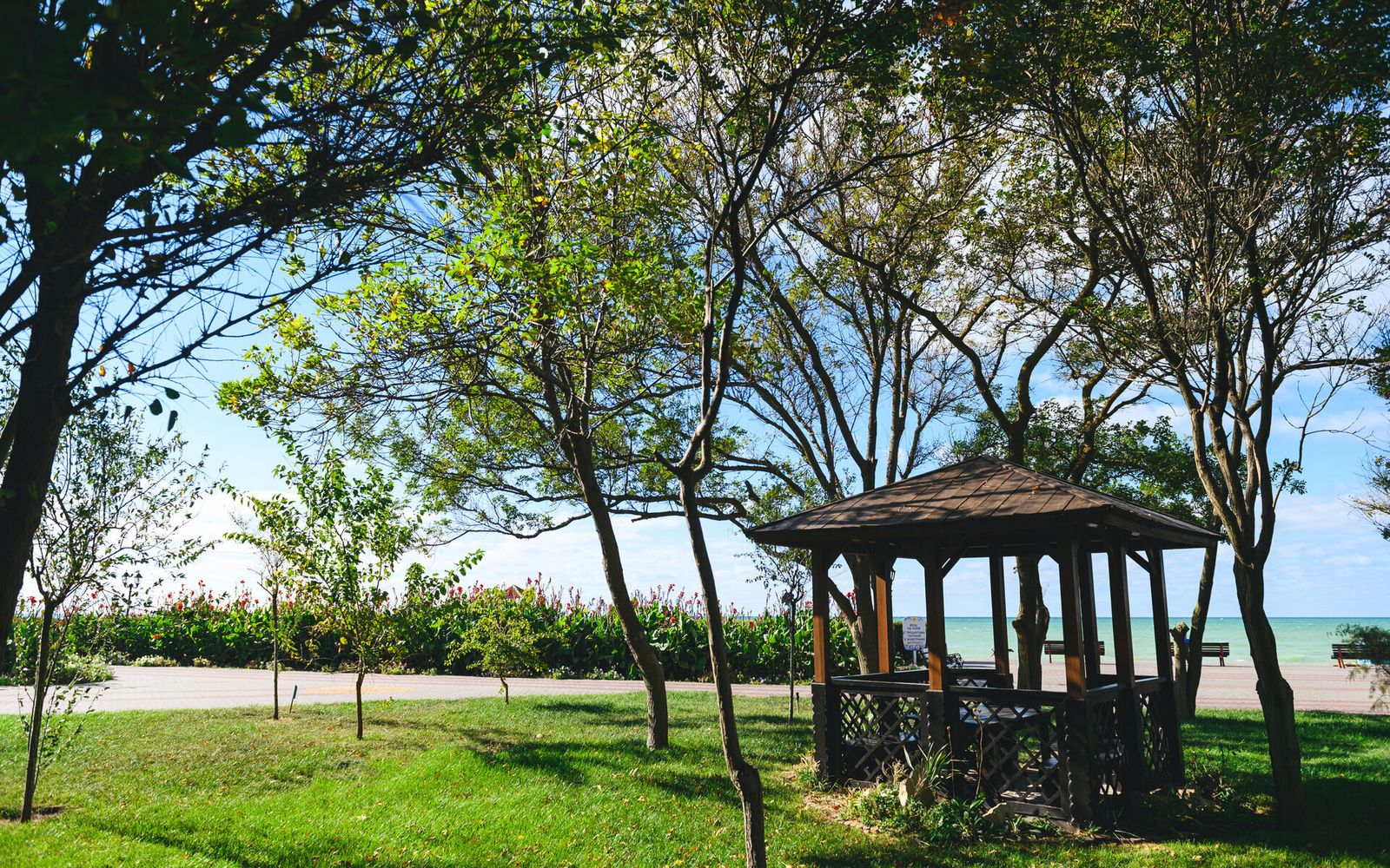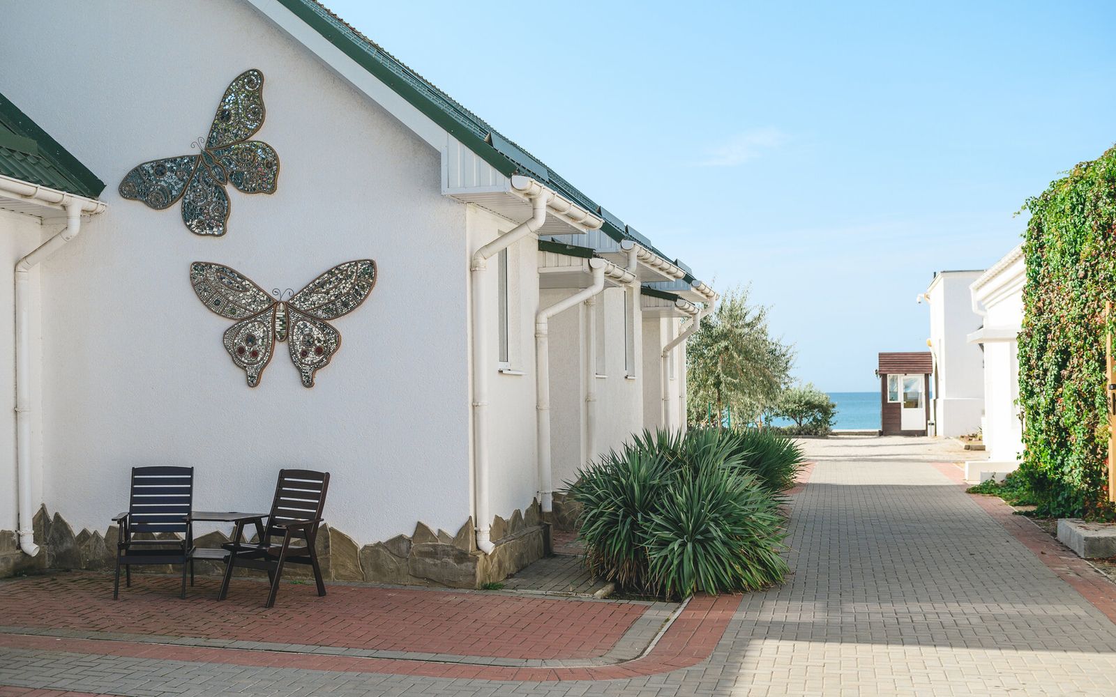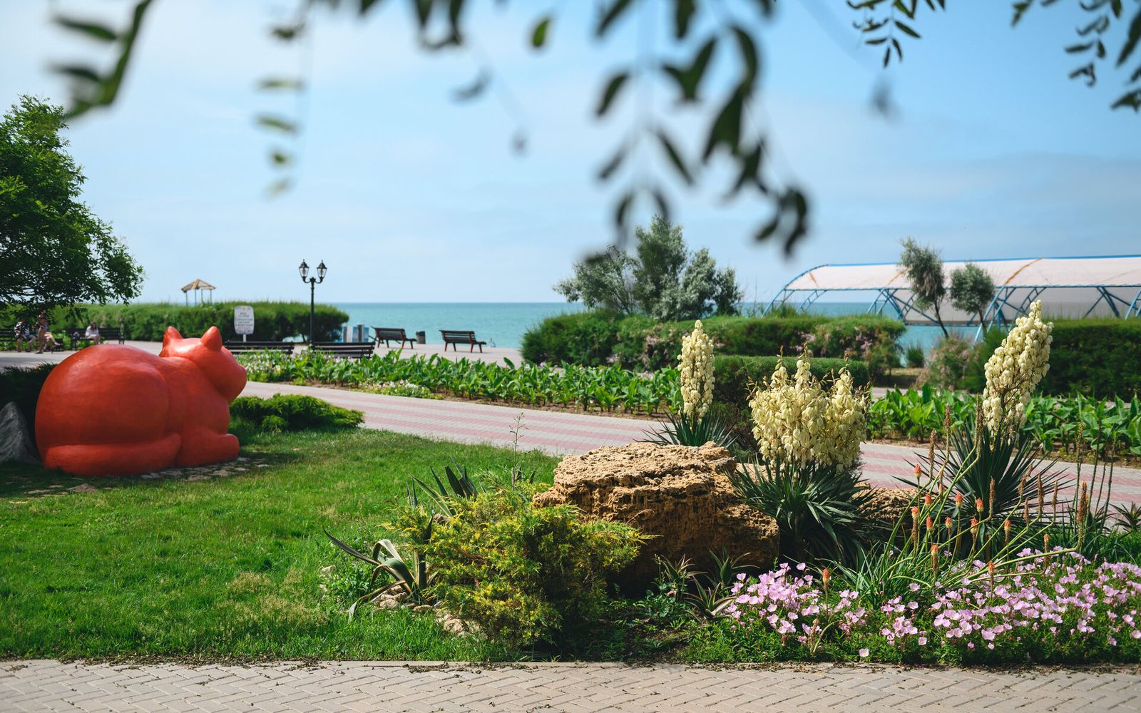 Расположение на первой линии у моря — корпуса в 20–30 м от песчано-галечного пляжа, оборудованного шезлонгами, навесами, душевыми и медпостом