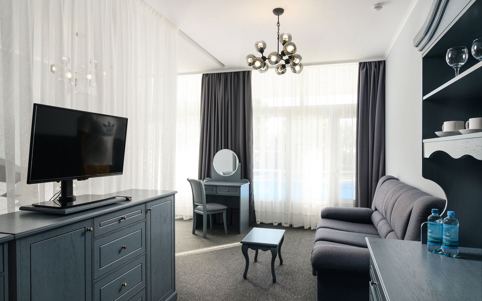 Сервис: Банное полотенце и два средних полотенца на каждого гостя, жидкое мыло, гель для душа, блюдо для фруктов, графин, два стакана, ложка для обуви, фумигатор (в летнее время), пляжное покрывало по запросу (в летнее время).