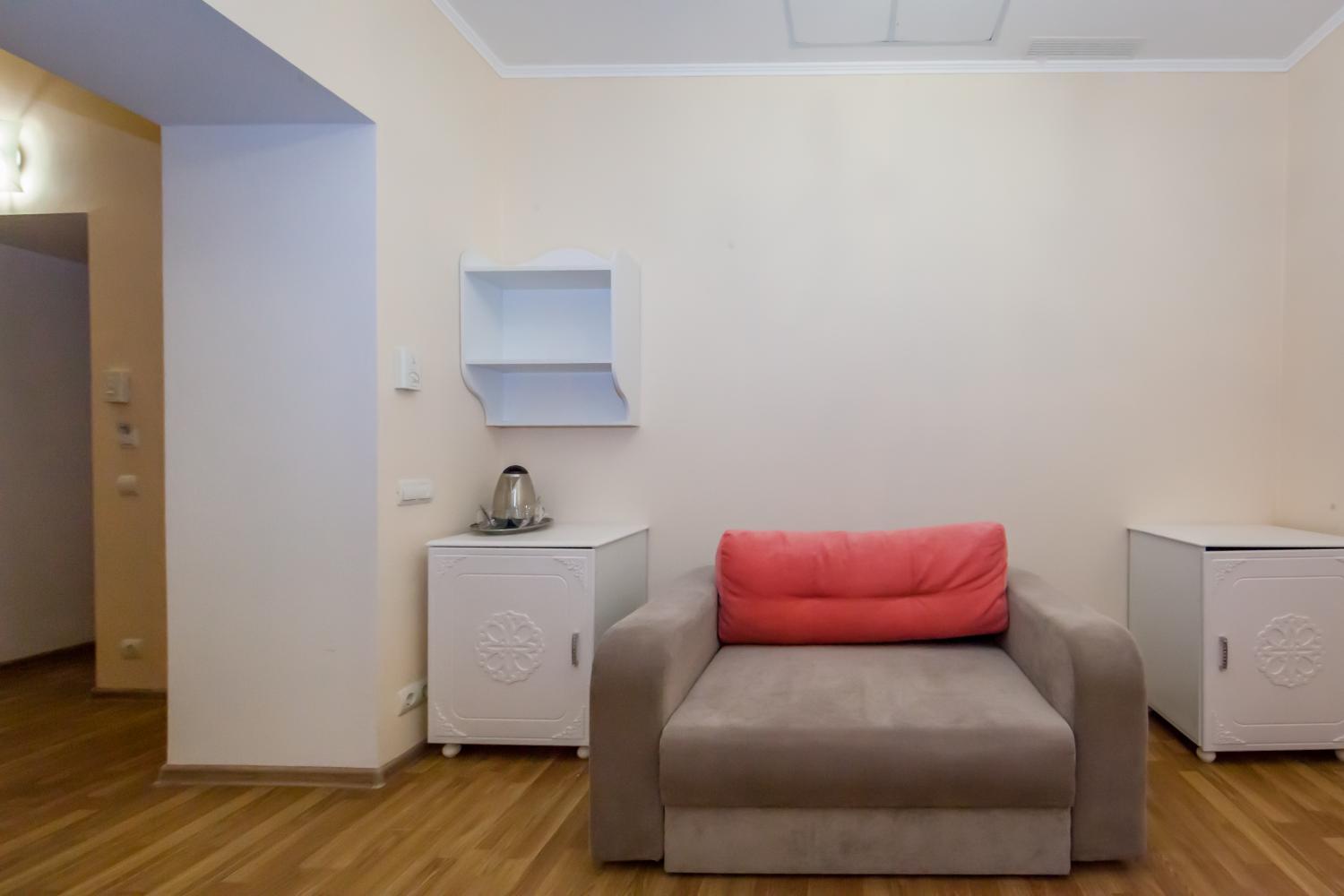 Оборудование: LCD-телевизор с кабельным цифровым TV, доступ к сети Internet, холодильник, чайник, 2 чашки, сушилка для одежды, сплит-система, фен, сейф.