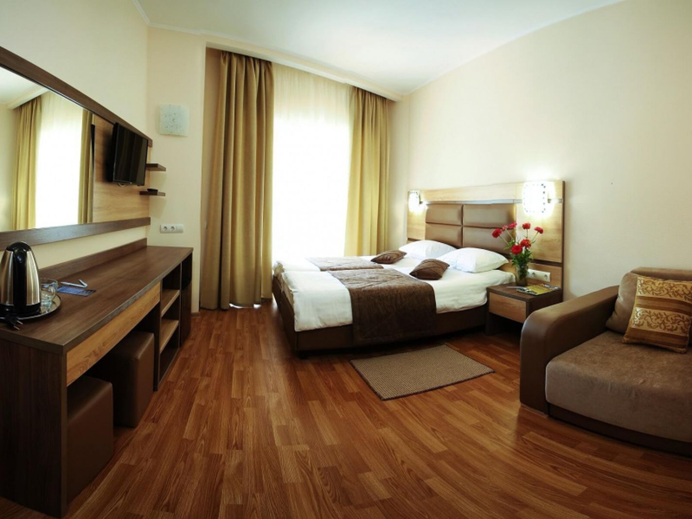 Мебель: Качественная деревянная мебель, две раздельные кровати с ортопедическими матрасами.