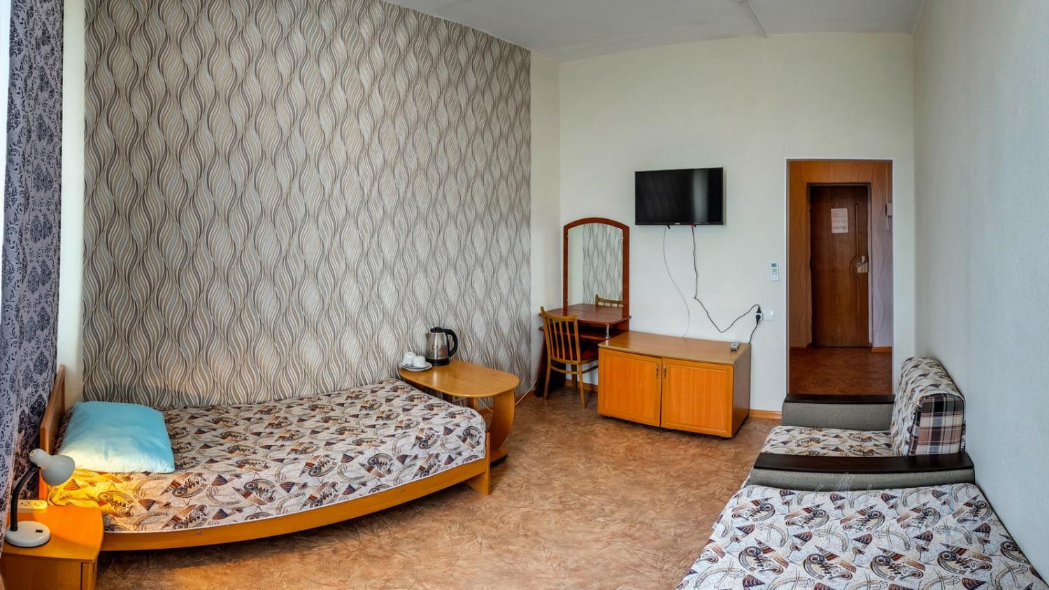 Мебель: Две односпальные кровати, две прикроватные тумбочки, шкаф для одежды. Дополнительное спальное место (раскладной диван или кресло-кровать).