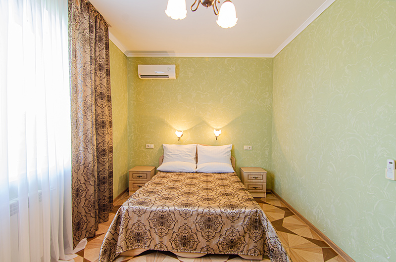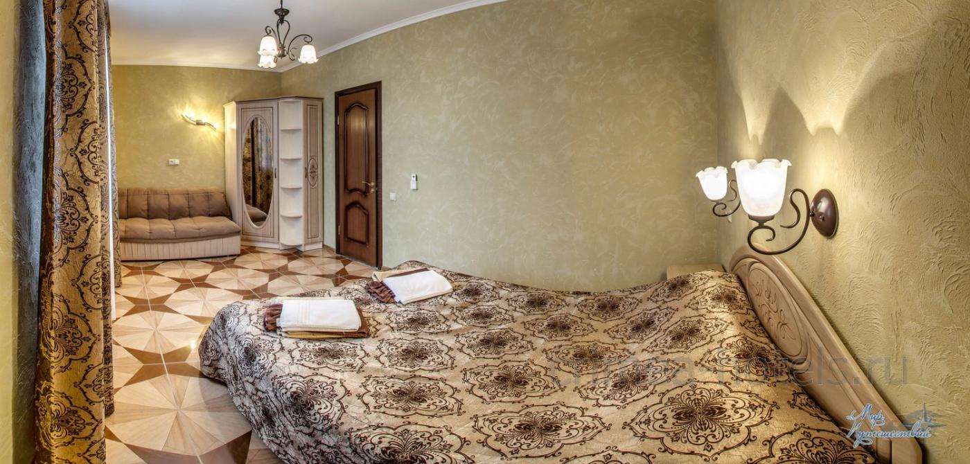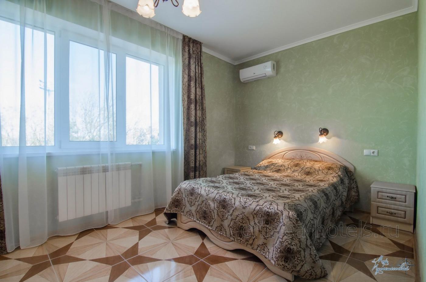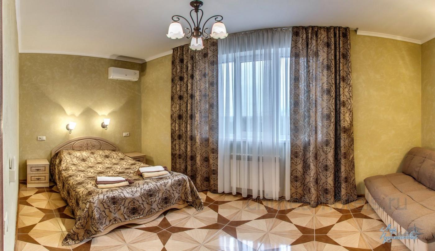 Мебель: Двуспальная кровать, две прикроватные тумбочки, шкаф для одежды. Дополнительное спальное место (раскладной диван или кресло-кровать).