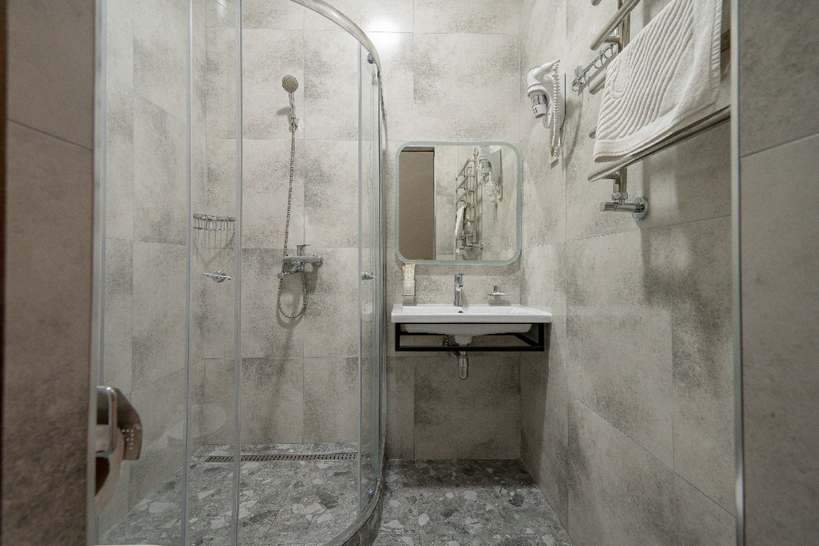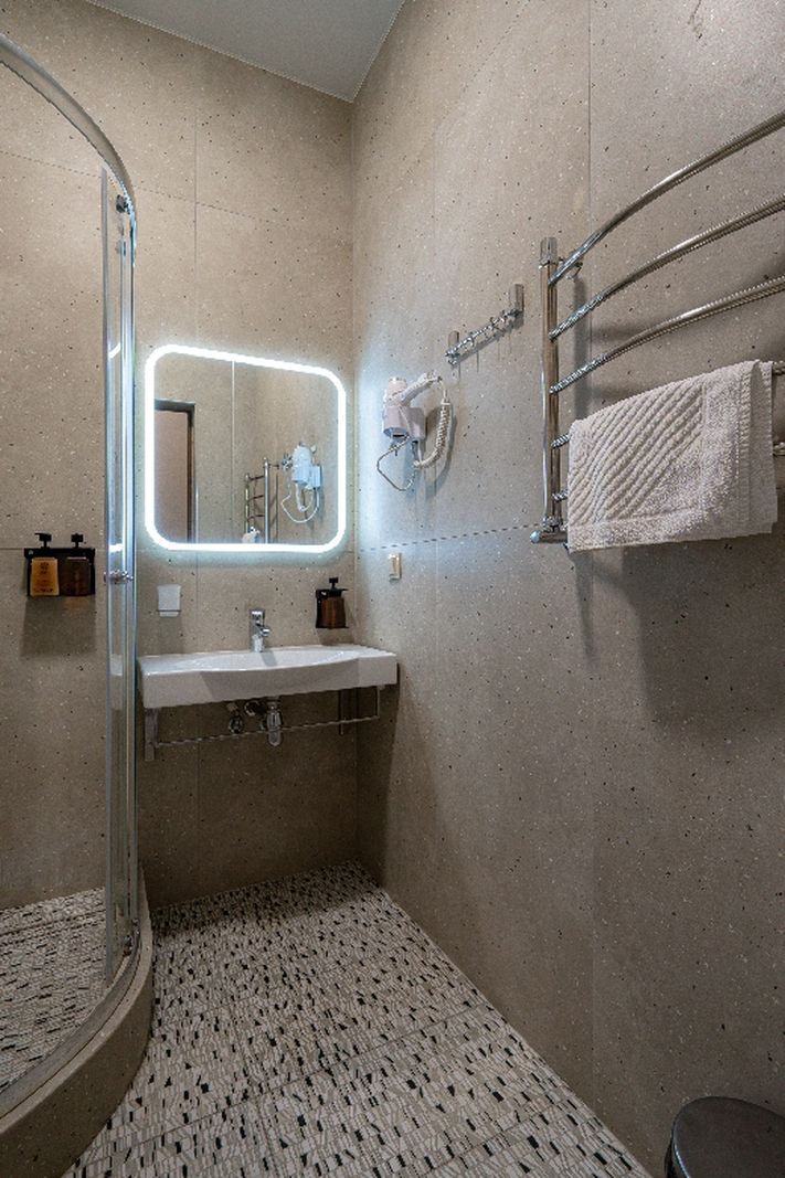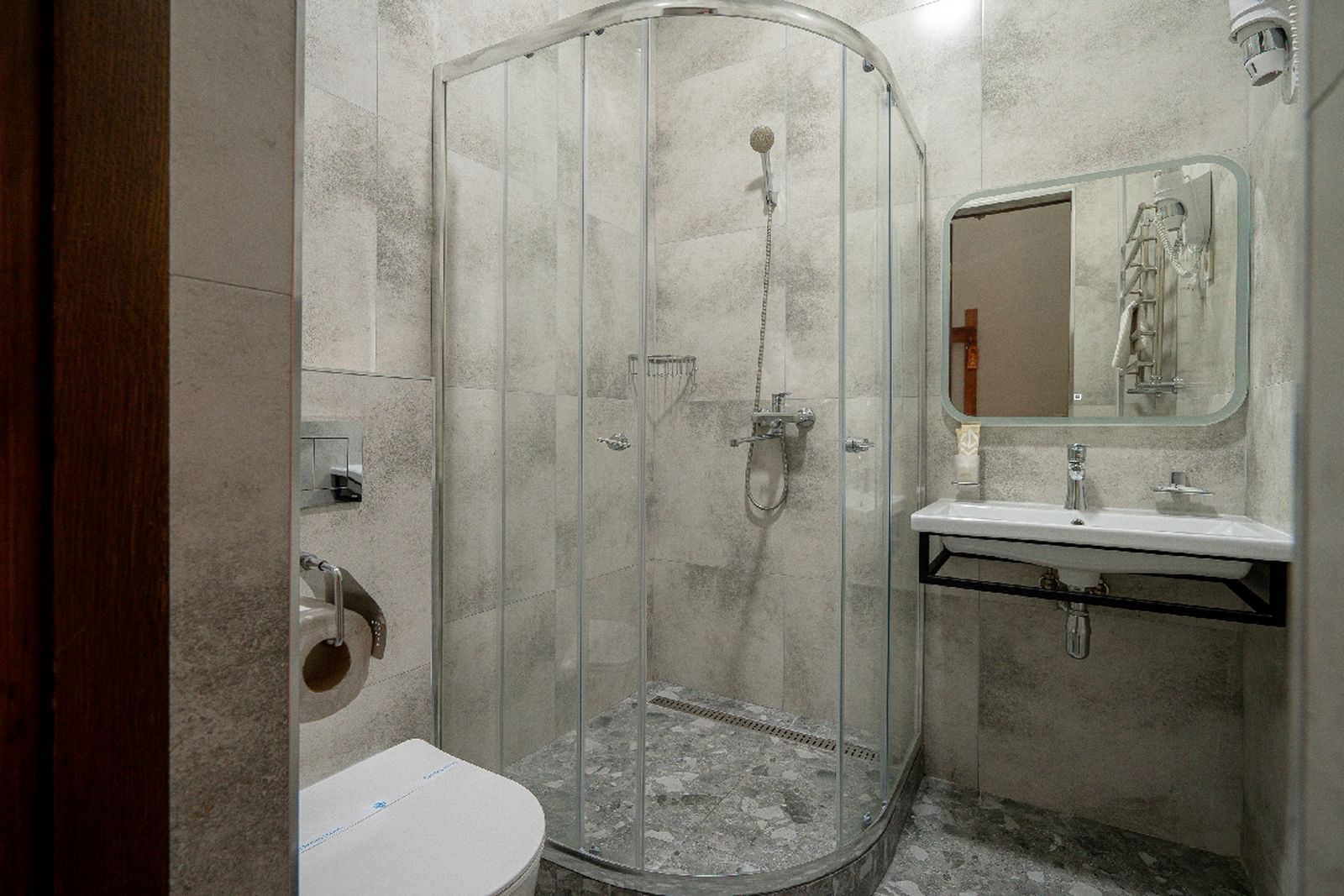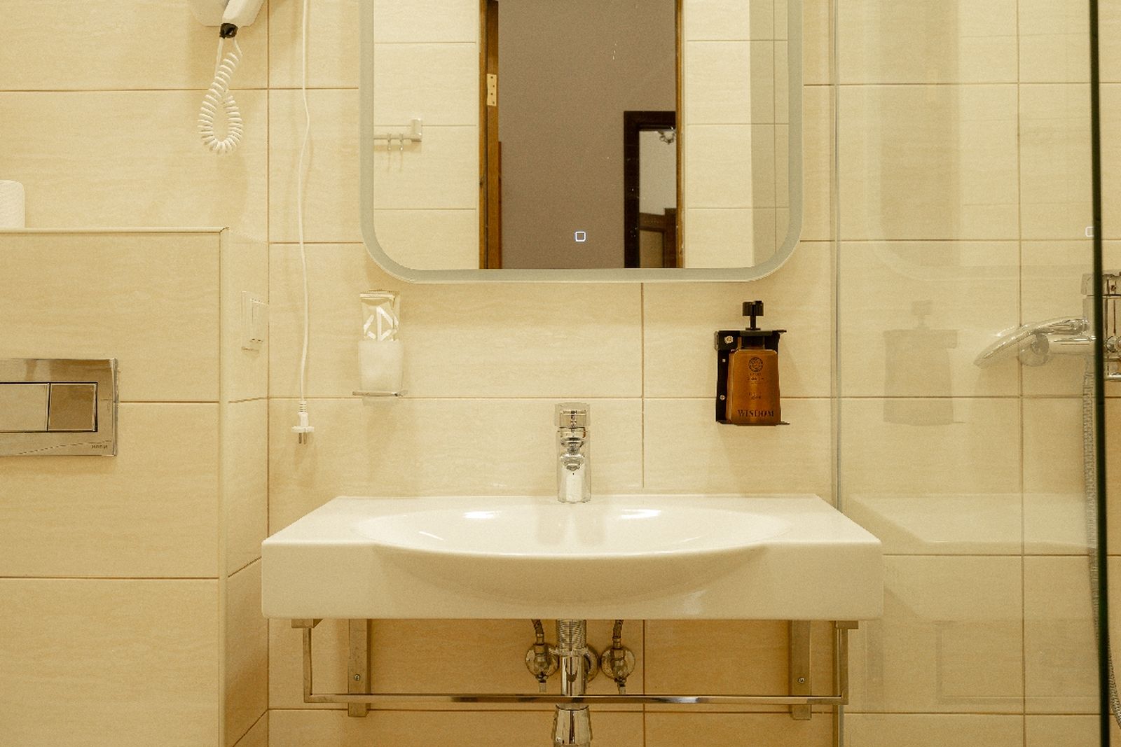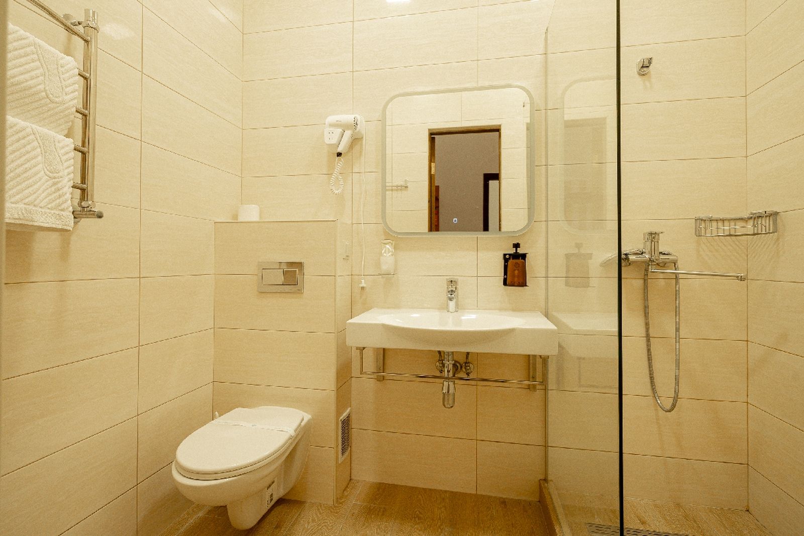 Санузел: душевая, туалетные принадлежности, фен.