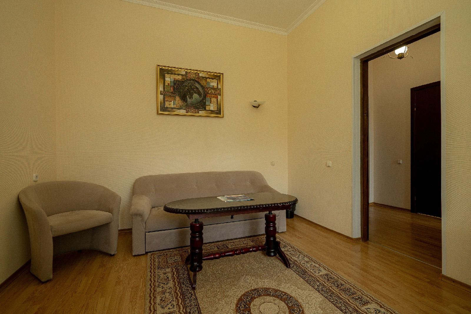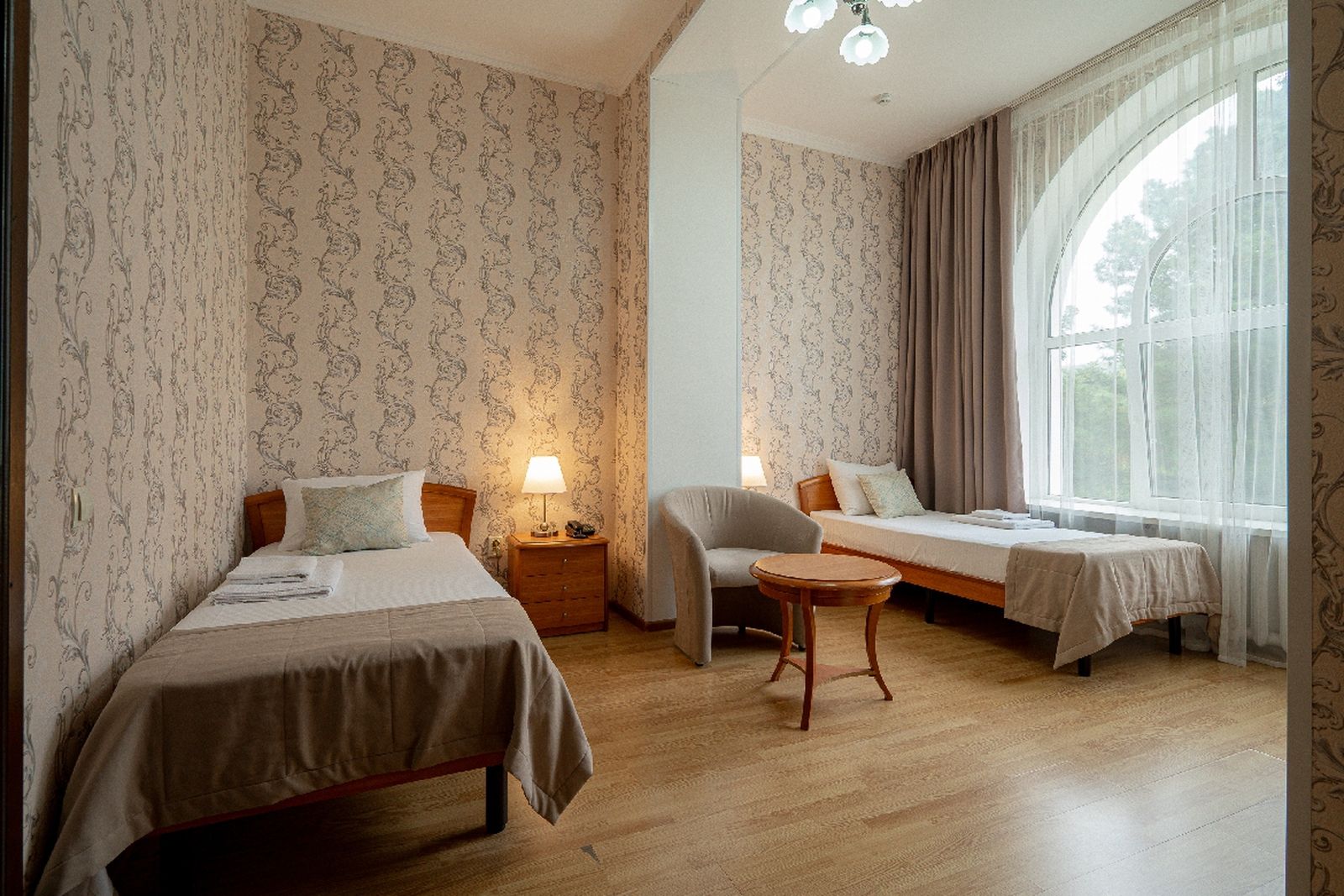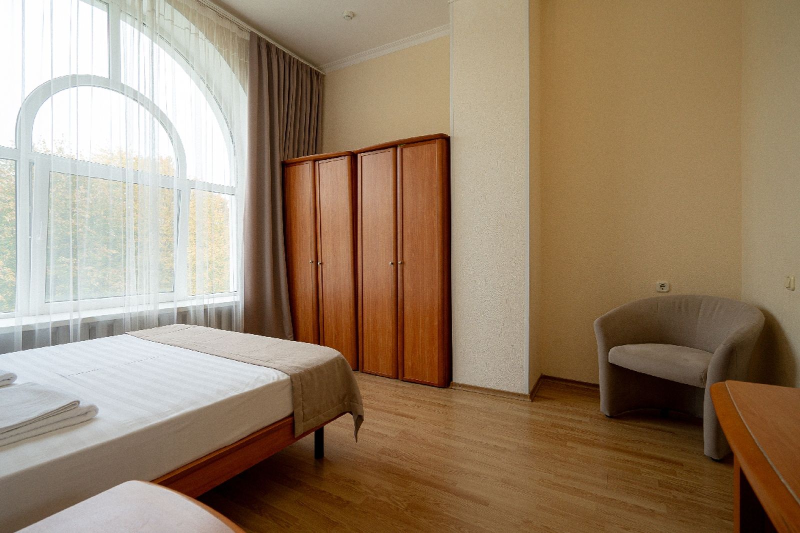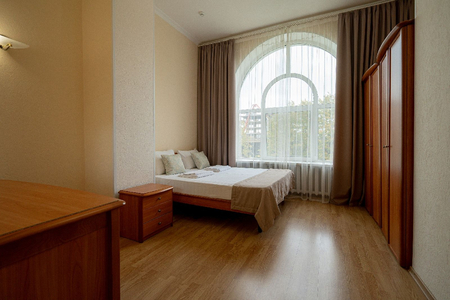 Мебель: вешалка, диван раскладной, зеркало, кресла, кровати односпальные /одна двуспальная кровать, прикроватные тумбочки, стол, стул, шкаф.