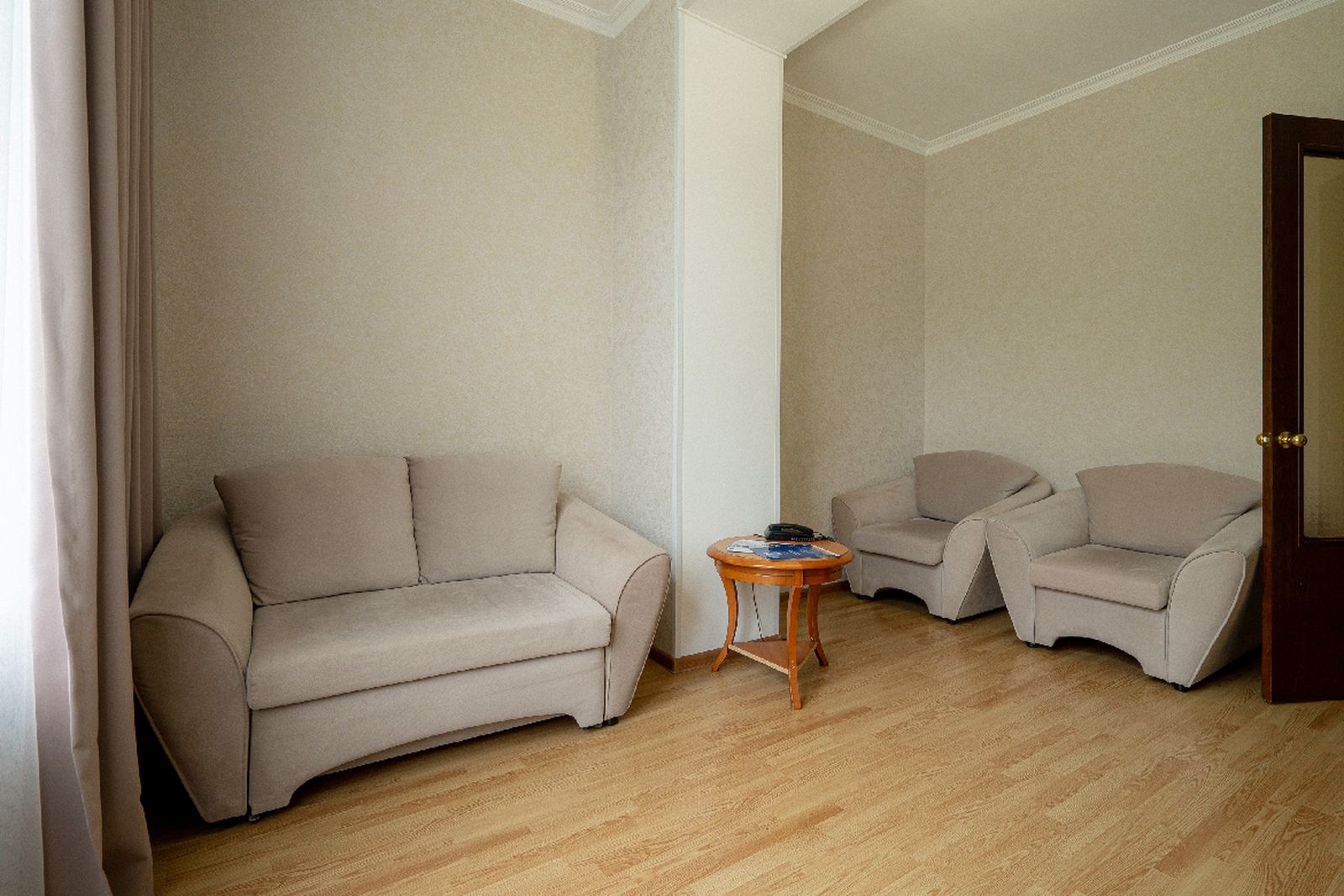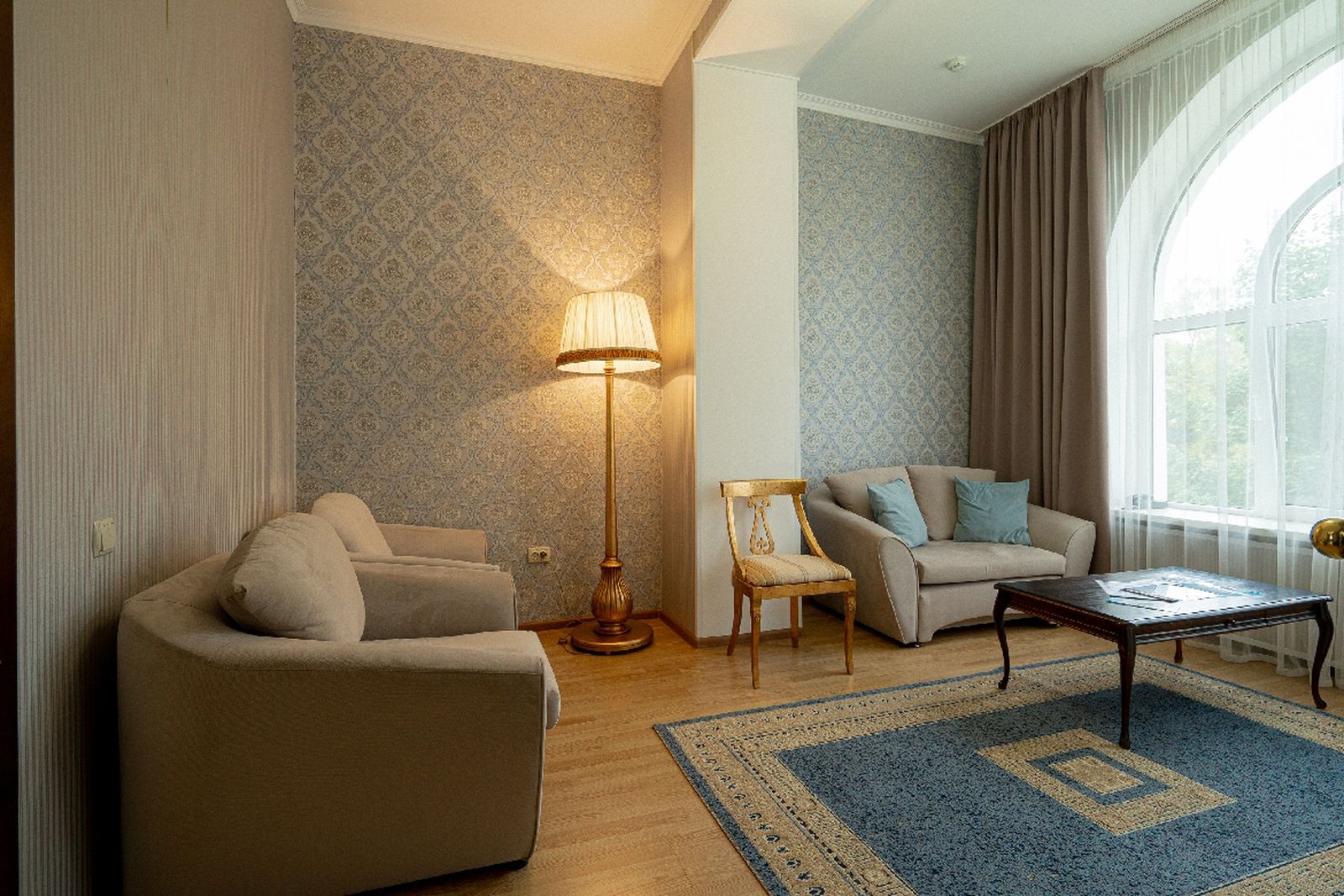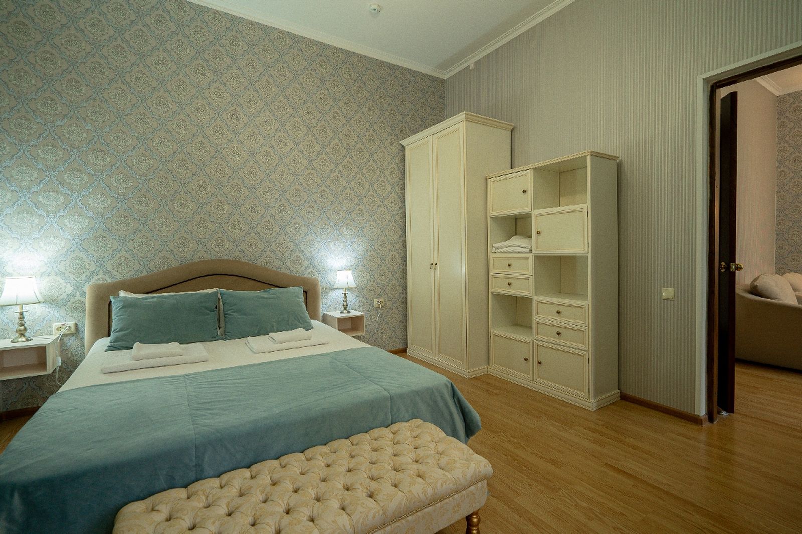 Мебель: вешалка, диван раскладной, зеркало, кресла, кровати односпальные /одна двуспальная кровать, прикроватные тумбочки, стол, стул, шкаф.