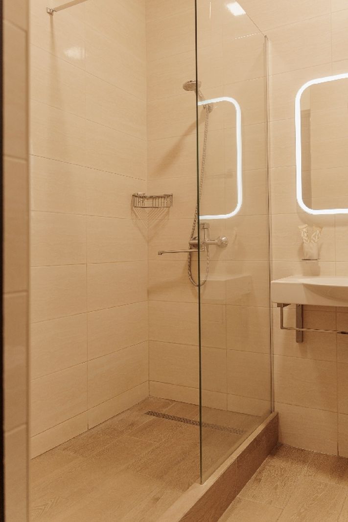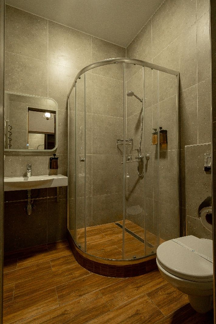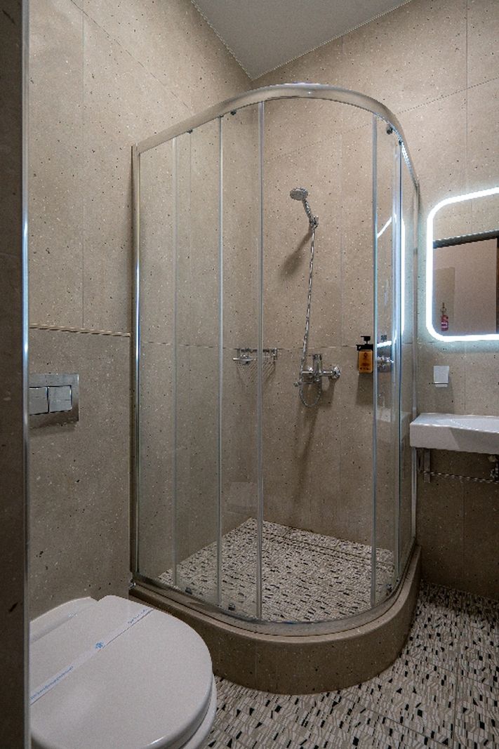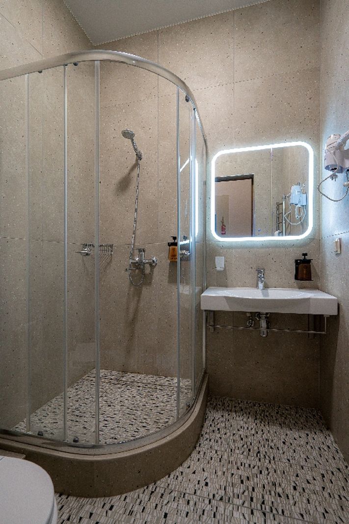 Санузел: с душевой кабиной, туалетные принадлежности, фен.