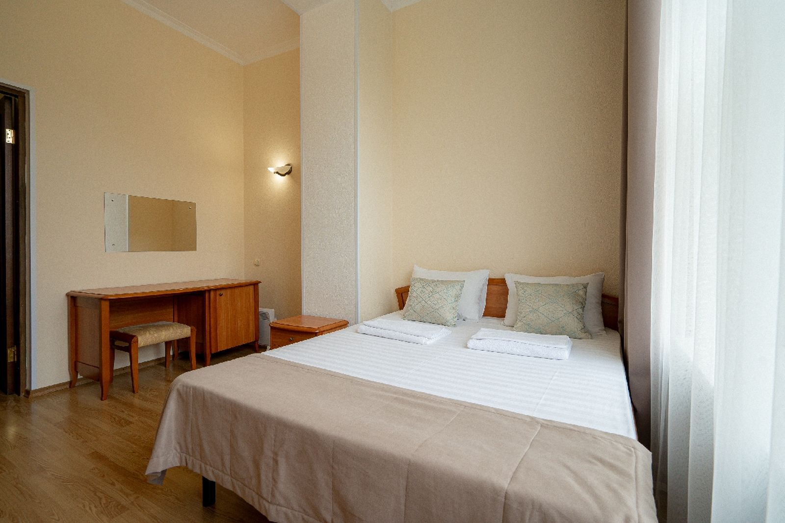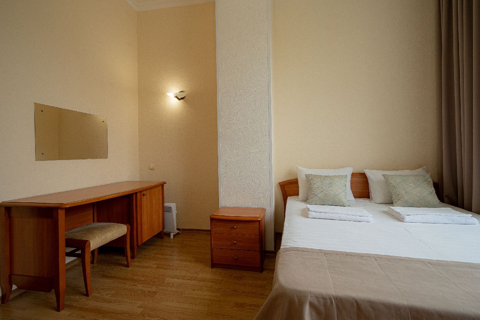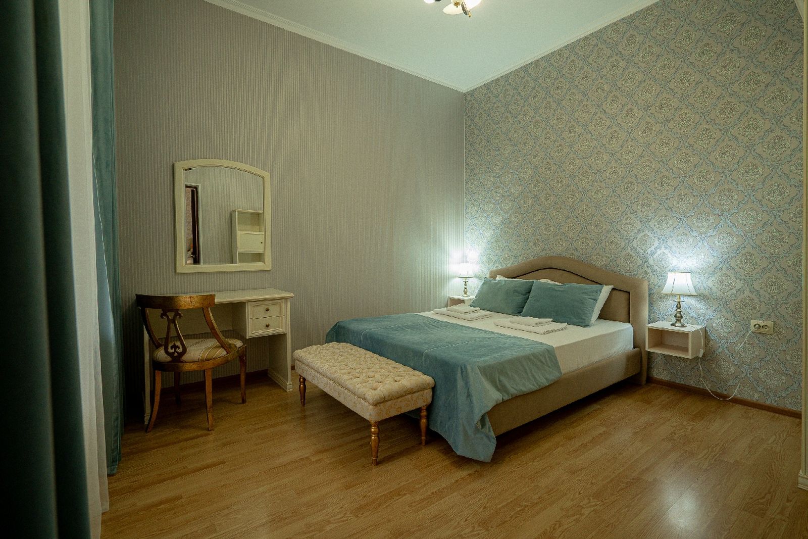 Мебель: вешалка, зеркало, кровати односпальные, кровать двуспальная, прикроватные тумбочки, стол, столик туалетный, стулья, шкаф.