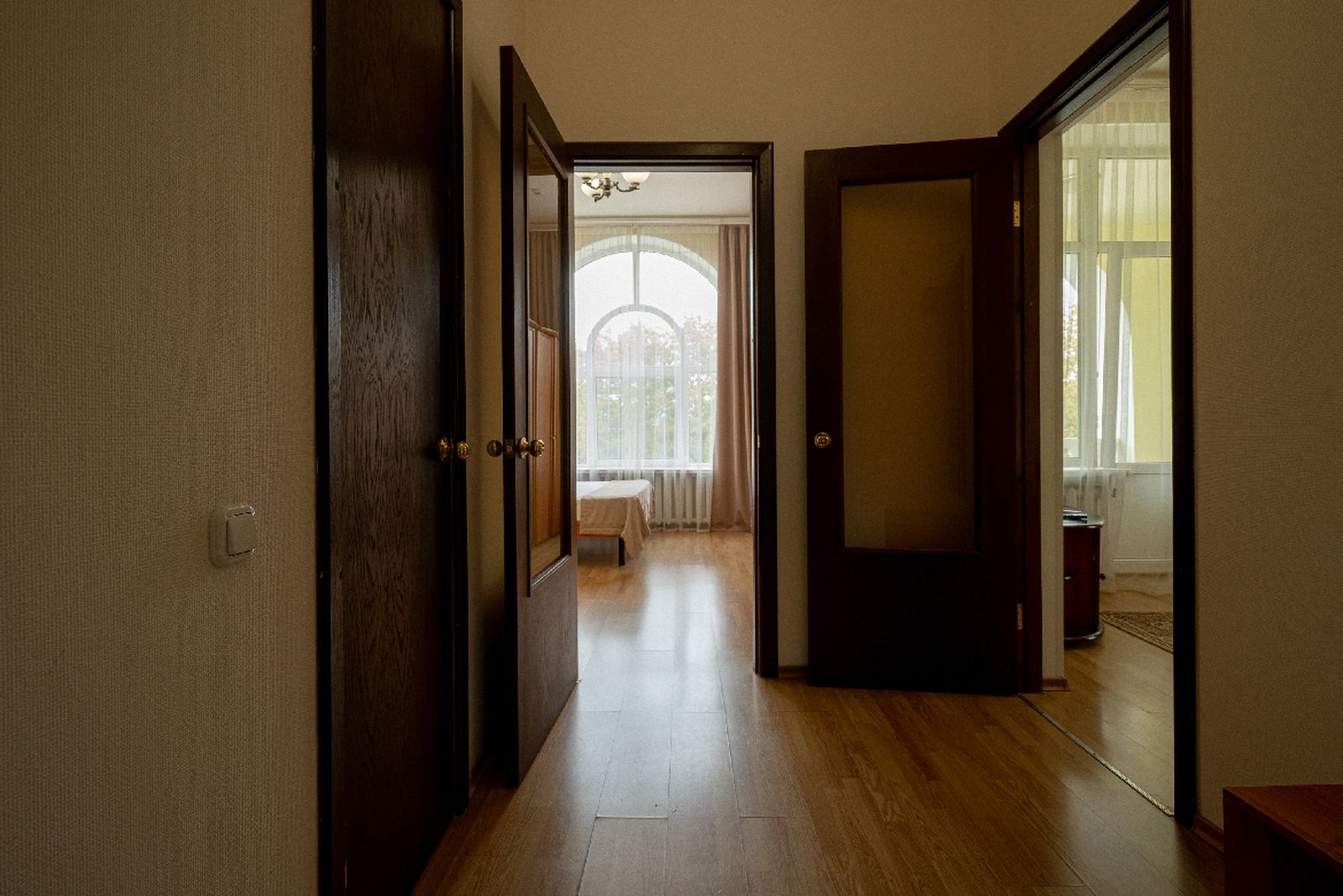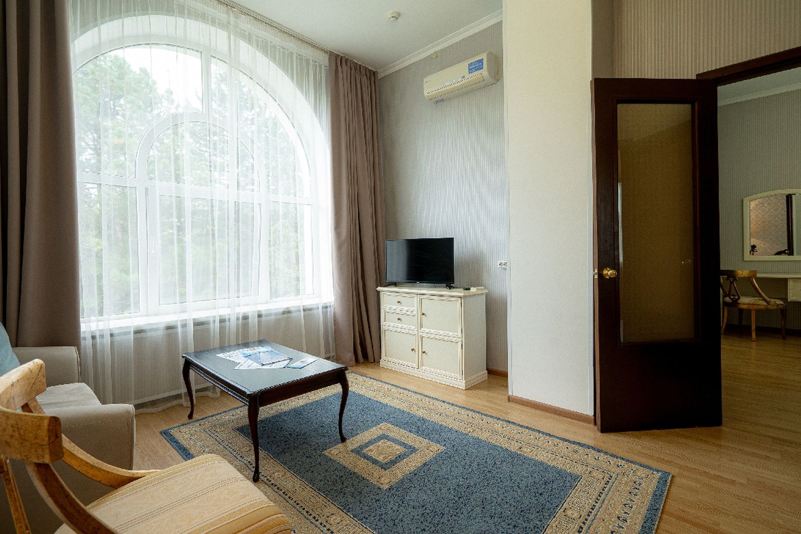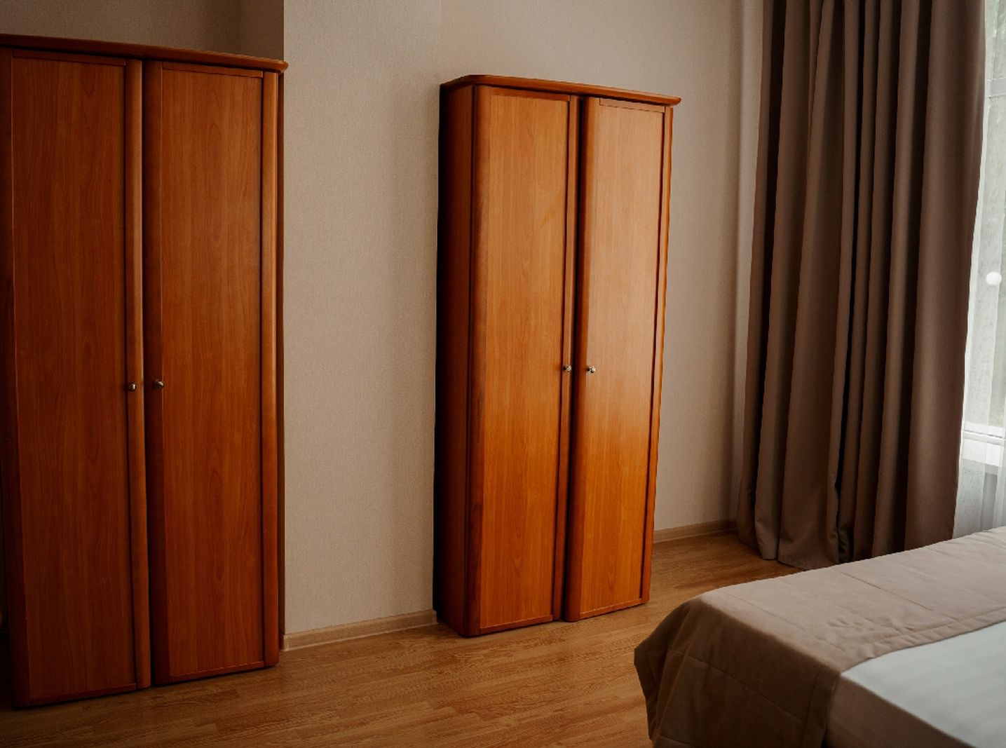 Мебель: вешалка, зеркало, кровати односпальные, кровать двуспальная, прикроватные тумбочки, стол, столик туалетный, стулья, шкаф.
