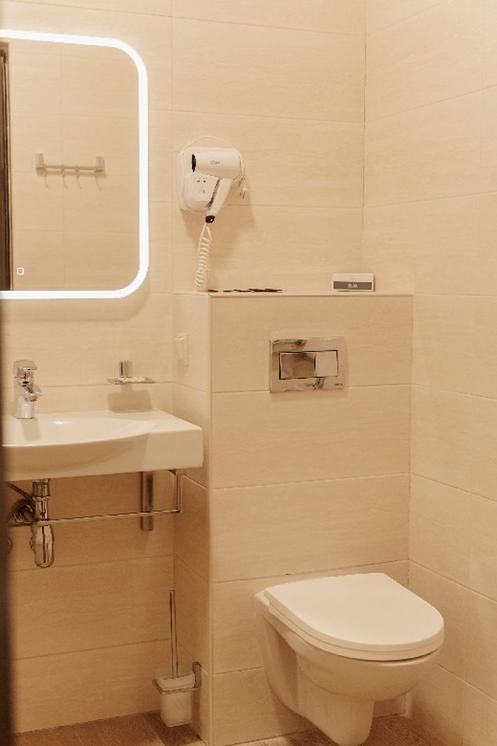 Санузел: с ванной или душевой кабиной, туалетные принадлежности, фен.