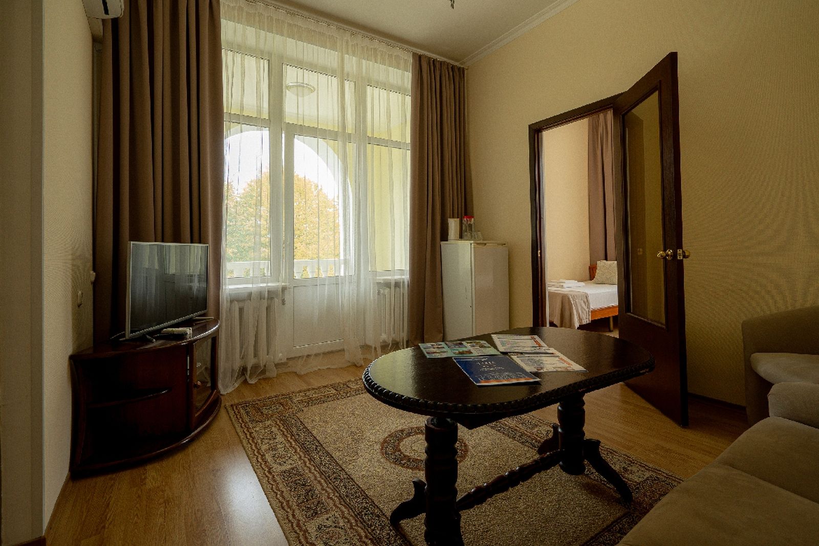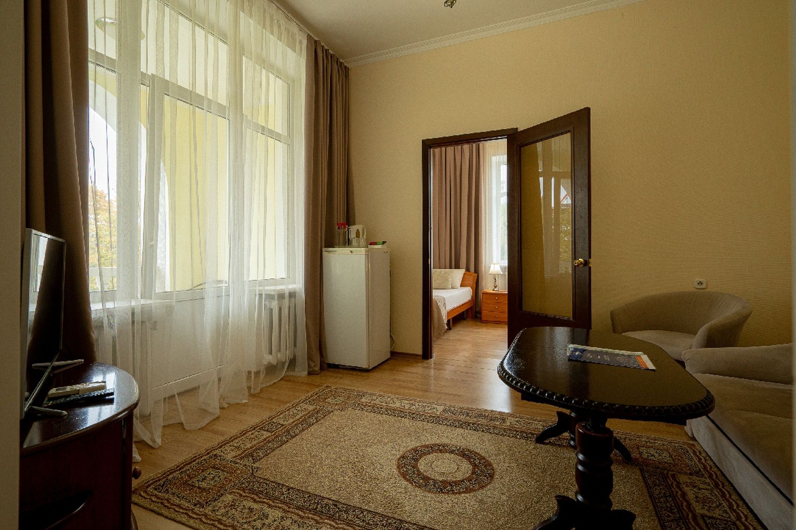 Оборудование: телевизор, телефон, холодильник, чайный набор посуды, электрочайник.
