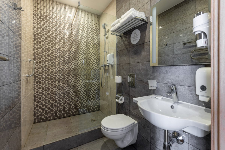 Санузел: с душевой кабиной, тапочки, туалетные принадлежности, фен.