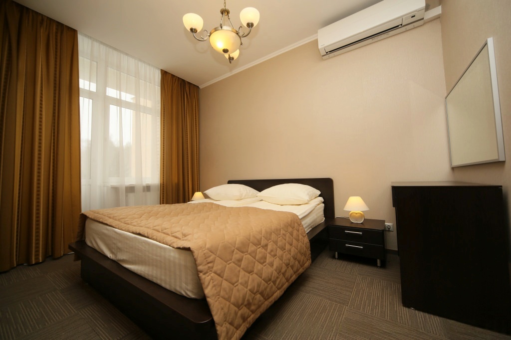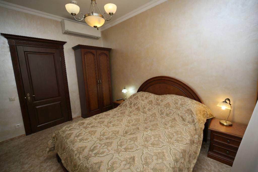 Мебель: Три двуспальные кровати, диван, обеденный стол, журнальные столики, шкафы, тумбы.