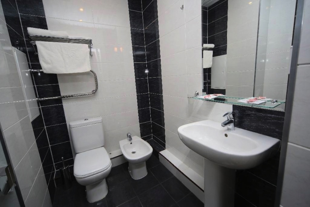 Санузел: Две ванные комнаты с душевыми кабинами, туалет, раковины, зеркала, гигиенические принадлежности.