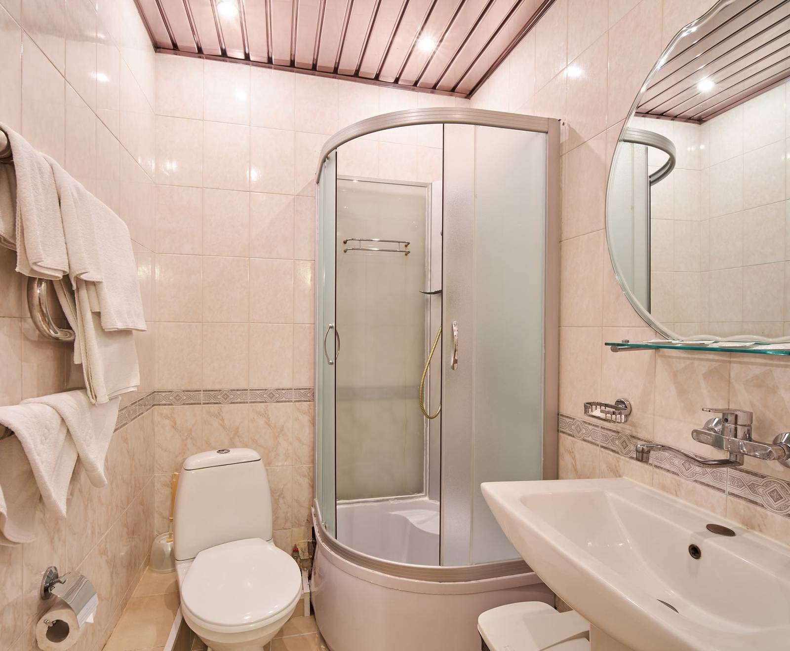 Санузел: с душевой кабиной, туалетные принадлежности, фен.